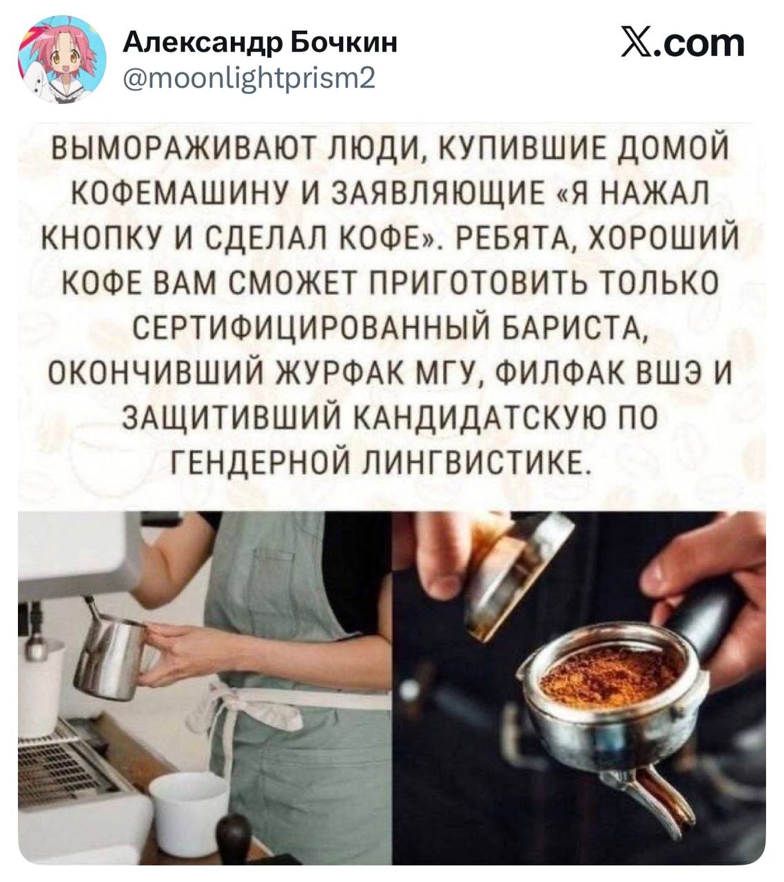 На данном изображении представлен скриншот из Твиттера (сейчас X.com) пользователя по имени Александр Бочкин с ником @moonlightprism2. В его твите говорится: "Вымораживают люди, купившие домой кофемашину и заявляющие «Я нажал кнопку и сделал кофе». Ребята, хороший кофе вам сможет приготовить только сертифицированный бариста, окончивший журфак МГУ, филфак ВШЭ и защитивший кандидатскую по гендерной лингвистике". Ниже твита расположены две фотографии, иллюстрирующие процесс приготовления кофе. На левой фотографии руки человека в фартуке держат питчер с молоком у кофемашины, а на правой — руки крупным планом держат портафильтр с молотым кофе. Это демонстрирует сложность и искусство приготовления настоящего кофе, подразумевая, что это не просто "нажать кнопку", как иронично подчёркивается в тексте твита.