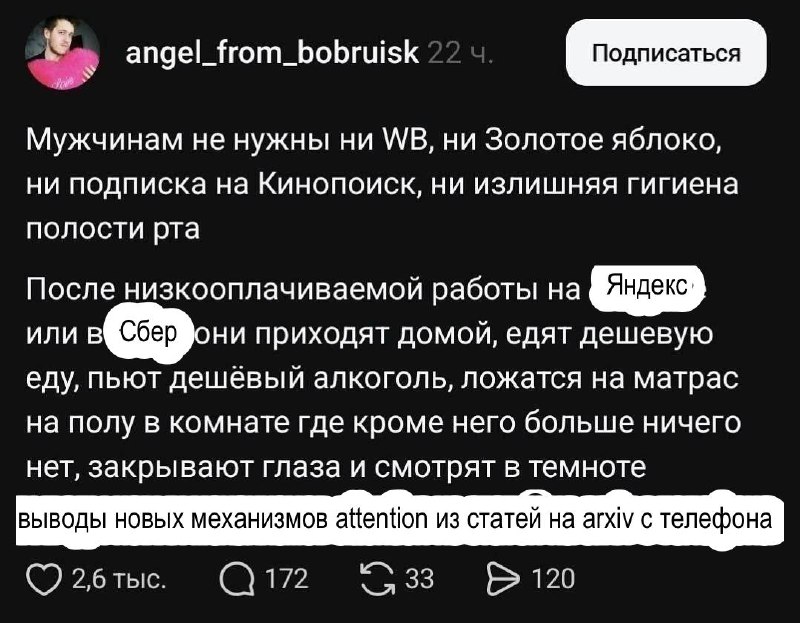 Мем представляет собой скриншот публикации пользователя angel_from_bobruisk в социальной сети. На черном фоне белым текстом написано сообщение, состоящее из двух частей. Первая часть описывает отсутствие у мужчин потребности в благах цивилизации, таких как WB, Золотое яблоко, подписка на Кинопоиск и излишняя гигиена полости рта. Вторая часть, более длинная и детализированная, повествует о том, как мужчины после низкооплачиваемой работы в Яндексе или Сбере приходят домой, едят дешевую еду, пьют дешевый алкоголь, ложатся на матрас на полу в пустой комнате, закрывают глаза и смотрят в темноте. Заканчивается сообщение словами про «выводы новых механизмов attention из статей на arxiv с телефона», что создает абсурдный и комичный контраст с предыдущим описанием быта. Над сообщением виден аватар пользователя — молодой человек с розовым сердцем в руках, а также его никнейм и время публикации. Под постом отображаются иконки "лайк", "комментарий", "репост" и "отправка", а также количество соответствующих действий: 2,6 тыс. лайков, 172 комментария, 33 репоста и 120 отправок. Мужчинам не нужны ни WB, ни Золотое яблоко, ни подписка на Кинопоиск, ни излишняя гигиена полости рта. После низкооплачиваемой работы в Яндексе или Сбере они приходят домой, едят дешевую еду, пьют дешевый алкоголь, ложатся на матрас на полу в комнате, где кроме него больше ничего нет, закрывают глаза и смотрят в темноте выводы новых механизмов attention из статей на arxiv с телефона.
