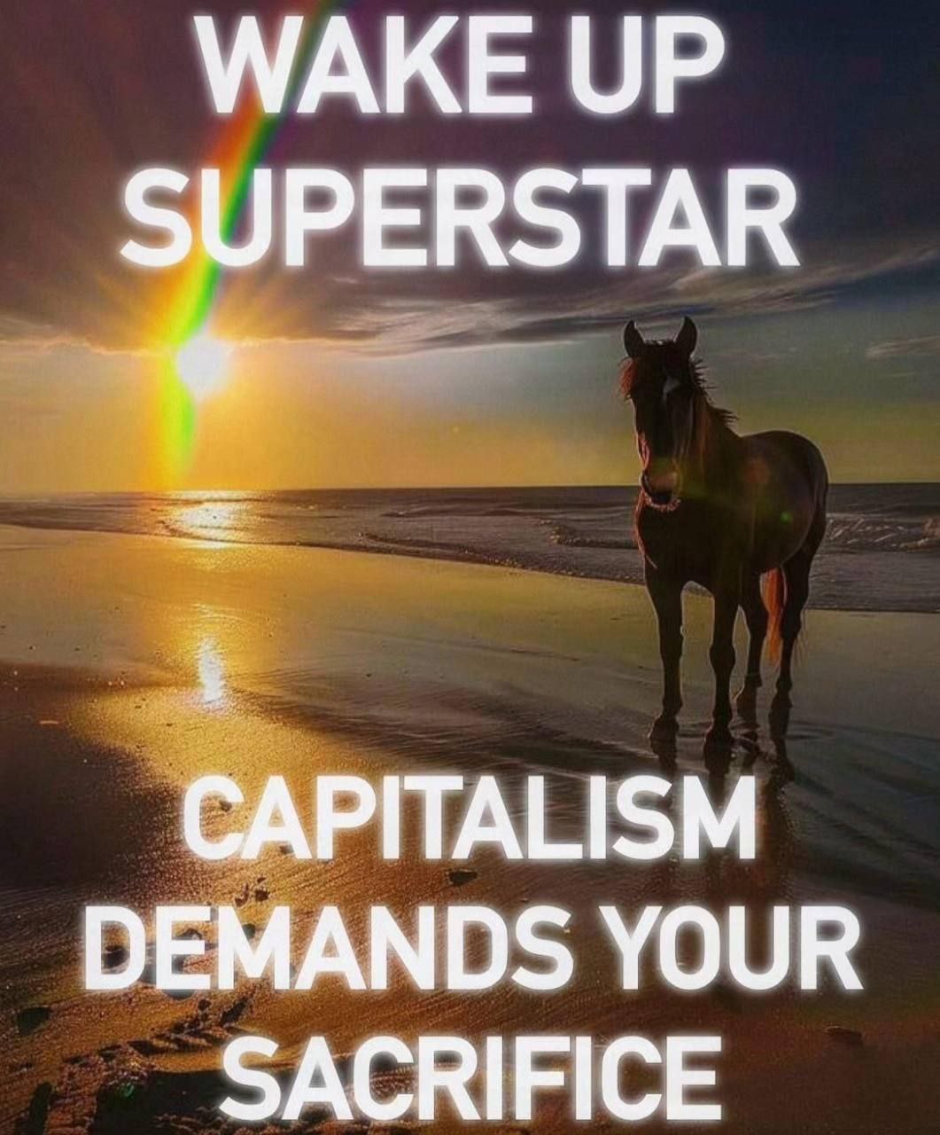 На изображении представлен живописный закат или рассвет на песчаном пляже. Солнце находится низко над горизонтом, отбрасывая золотистые отблески на мокрую прибрежную полосу и волны океана. Небо окрашено в темные тона, а слева видна яркая радуга, переливающаяся всеми цветами. В правой части кадра стоит темно-коричневая лошадь, смотрящая прямо на зрителя. Крупный белый текст наложен поверх изображения: «Wake up superstar. Capitalism demands your sacrifice», что переводится как «Проснись, суперзвезда. Капитализм требует твоей жертвы».