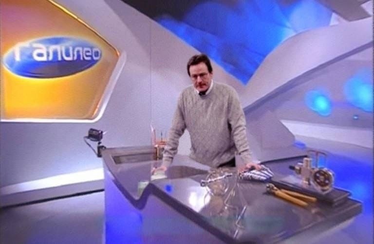 На изображении показан мужчина, очень похожий на персонажа Уолтера Вайта из сериала «Во все тяжкие», стоящий за лабораторным столом в студии программы «Галилео». Он одет в серый свитер и белую рубашку, смотрит прямо в камеру с задумчивым выражением лица. На столе перед ним лежат различные инструменты, включая гаечные ключи и измерительные приборы. На заднем плане виден логотип программы «Галилео» и элементы декора студии в сине-белых тонах, создающие атмосферу научного эксперимента или объяснения.