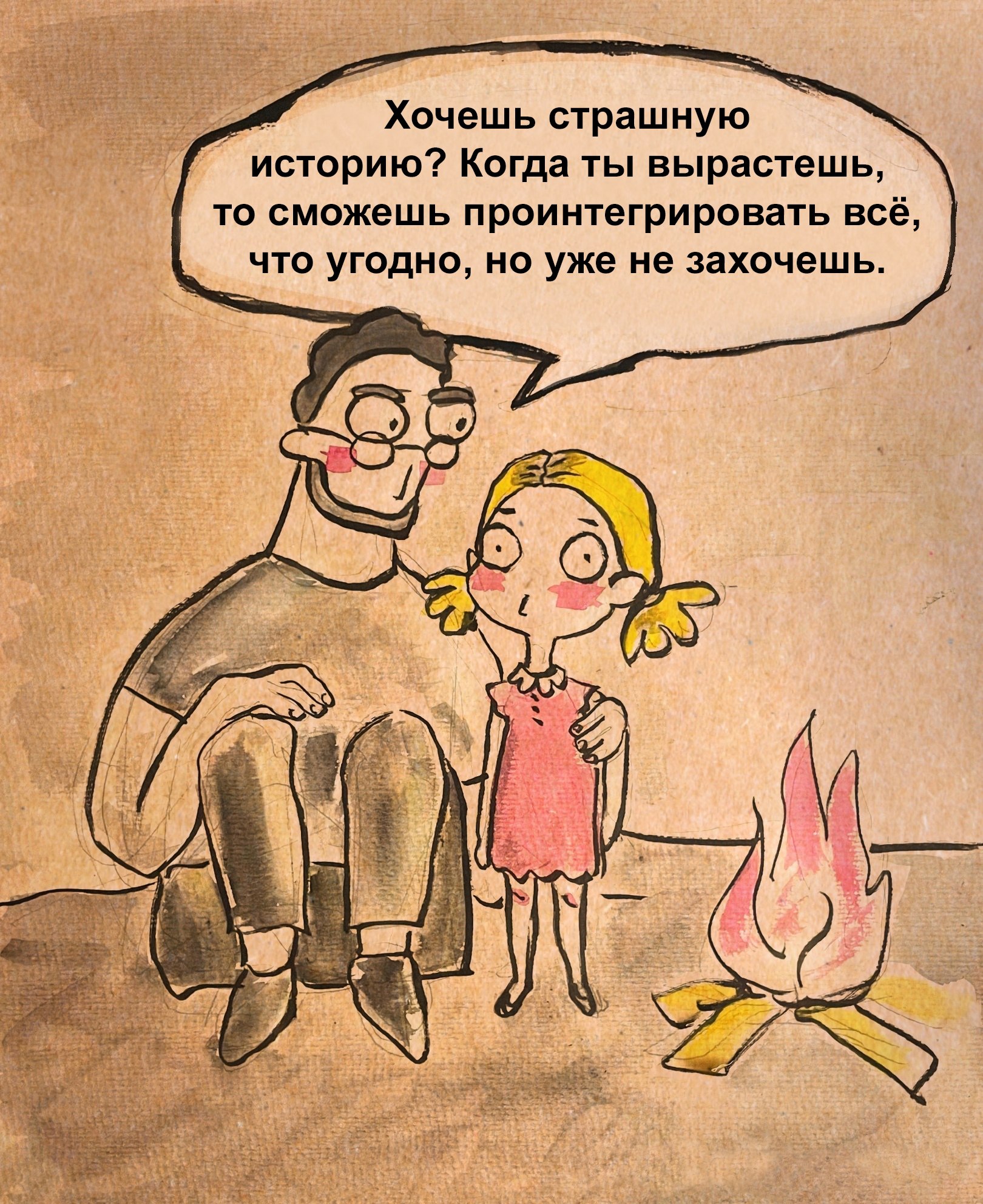 На картинке изображены мужчина и маленькая девочка, сидящие у небольшого костра. Мужчина, в очках и с бородой, сидит в позе лотоса и обнимает девочку. Девочка с двумя хвостиками стоит рядом, держась за его руку, и с широко раскрытыми глазами слушает его. Над их головами расположено облачко с текстом, имитирующее речь. Текст на меме гласит: "Хочешь страшную историю? Когда ты вырастешь, то сможешь проинтегрировать всё, что угодно, но уже не захочешь". Это фраза про взросление и математическую интеграцию, которая пугает девочку.