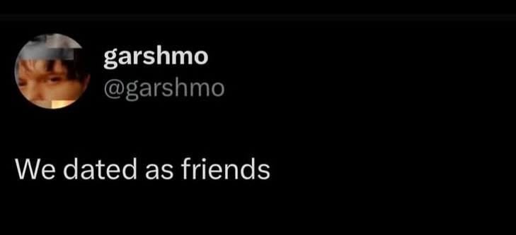 На изображении представлен скриншот из Твиттера с темным фоном. В левой верхней части находится аватар профиля пользователя, на котором видна часть лица человека с карими глазами и челкой. Рядом с аватаром указано имя пользователя "garshmo" и его никнейм "@garshmo". Под этой информацией располагается белым шрифтом фраза "We dated as friends" (Мы встречались как друзья), которая является основным содержанием данного мема. Этот мем часто используется для описания ситуаций, когда отношения были более дружескими, чем романтическими, или когда люди пытаются сохранить дружбу после расставания.
