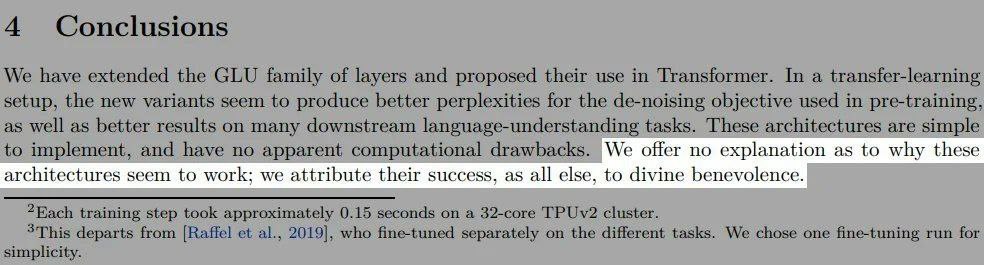 На изображении показан отрывок текста из научной статьи под заголовком "4 Conclusions". В тексте обсуждается расширение семейства слоев GLU и их применение в Transformer. Утверждается, что новые варианты дают лучшие результаты в задачах шумоподавления и понимания языка. Также указывается, что эти архитектуры просты в реализации и не имеют очевидных вычислительных недостатков. Однако авторы признаются, что не могут объяснить, почему эти архитектуры работают, и приписывают их успех, как и все остальное, божественному провидению. Это признание подчеркнуто в нижней части текста, выделяя комическую или ироничную часть научного исследования.