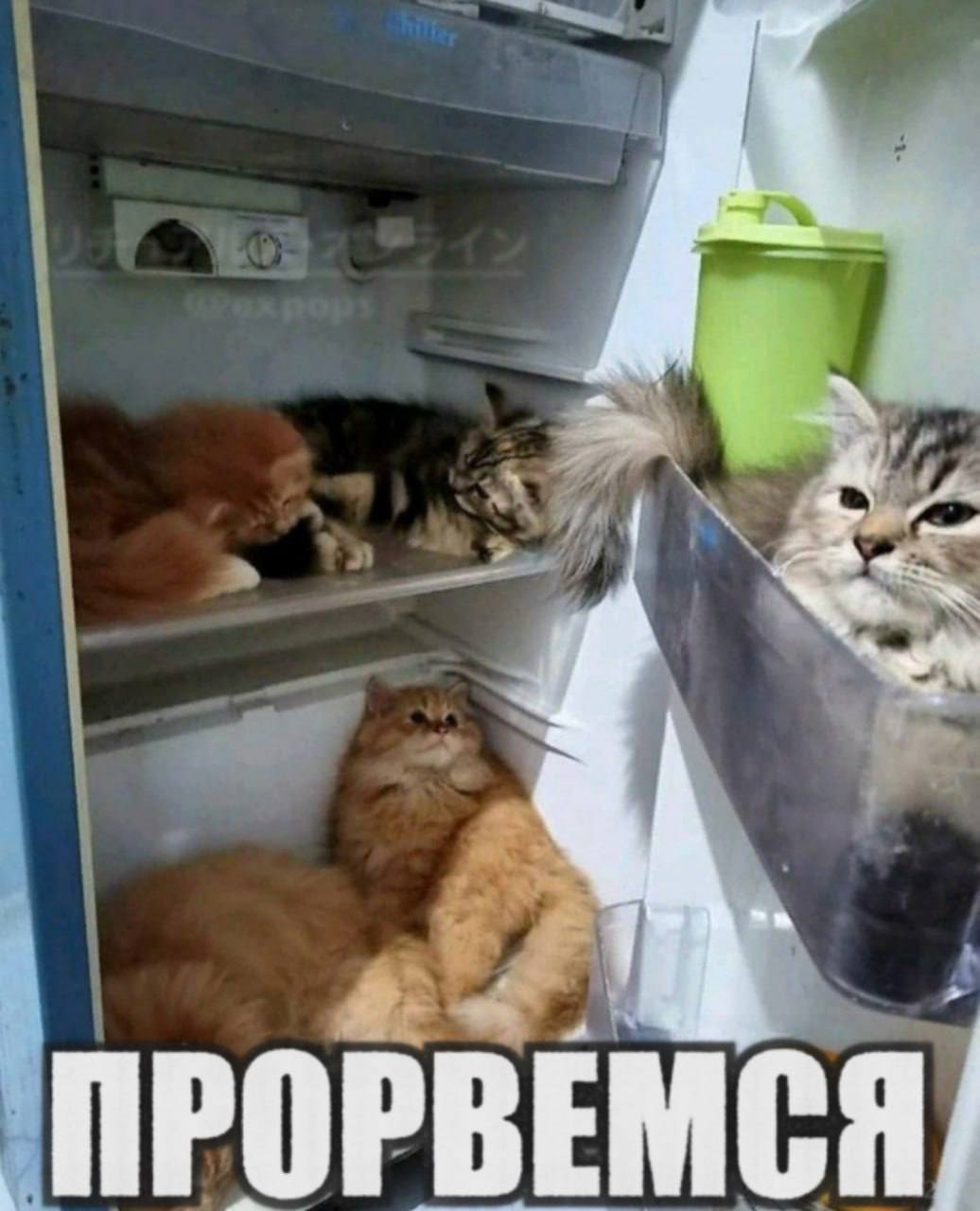 На изображении показан открытый холодильник, внутри которого на полках и в одной из дверных полостей разлеглись четыре пушистых кота. Двое из них, рыжий и полосатый, уютно спят на верхней полке. На дверце, в прозрачном отделении, сидит еще один полосатый кот, который, кажется, смотрит прямо на зрителя. На нижней полке также расположился большой рыжий кот, который сидит, прислонившись к стенке холодильника, с невозмутимым видом. Под ним находится надпись "ПРОРВЕМСЯ". Это выражение в данном контексте можно интерпретировать как позитивное отношение к необычной ситуации, намекая на то, что, несмотря на тесноту или странное место, коты чувствуют себя комфортно и справятся с любыми условиями, или просто намек на их настойчивость и способность выживать в любых условиях. Возможно, котам просто жарко, и они ищут прохладу.