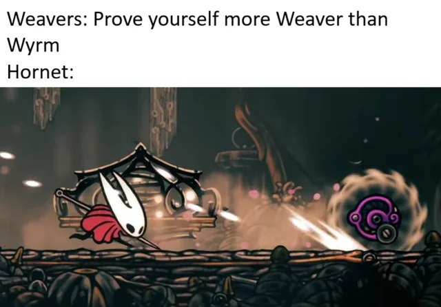Мем изображает Хорнет, одну из ключевых героинь игры Hollow Knight, в динамичной позе, готовящуюся к атаке или совершающую ее. Она одета в свой узнаваемый красный плащ и вооружена иглой. На заднем плане видна часть игрового мира с характерными элементами дизайна. Надпись на меме, "Weavers: Prove yourself more Weaver than Wyrm Hornet:", что переводится как «Ткачи: Докажи, что ты больше Ткач, чем Вирм. Хорнет:», отсылает к лору игры, где Хорнет является дочерью Ткачей и Вирма, и часто возникает вопрос, чья природа в ней преобладает. Мем обыгрывает эту дилемму, показывая, что Хорнет превосходит ожидания и доказывает свою принадлежность к Ткачам.
