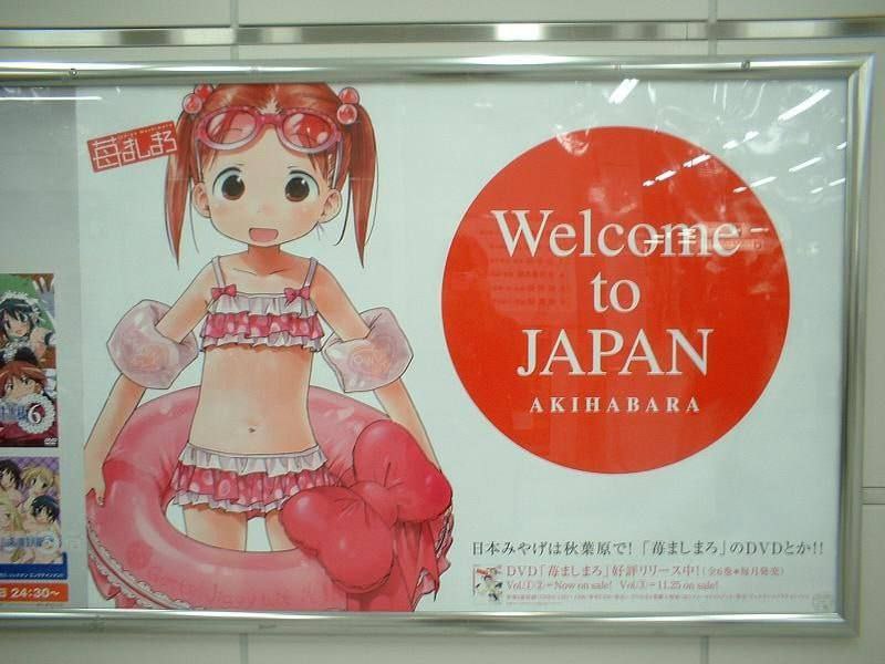 На рекламном плакате изображена милая аниме-девочка с рыжими волосами, собранными в два хвостика, в красных очках на голове и в розовом полосатом купальнике. Она также надевает розовые нарукавники и стоит в большом розовом надувном круге. На заднем плане виден красный круг с белой надписью "Welcome to JAPAN AKIHABARA" (Добро пожаловать в Японию, Акихабара). Плакат рекламирует DVD «Ичигэмашимаро» (Ichigemashimaro). Надпись «Welcome to JAPAN AKIHABARA» приглашает посетить Акихабару – район Токио, известный своей культурой аниме и манги, а также электроникой.