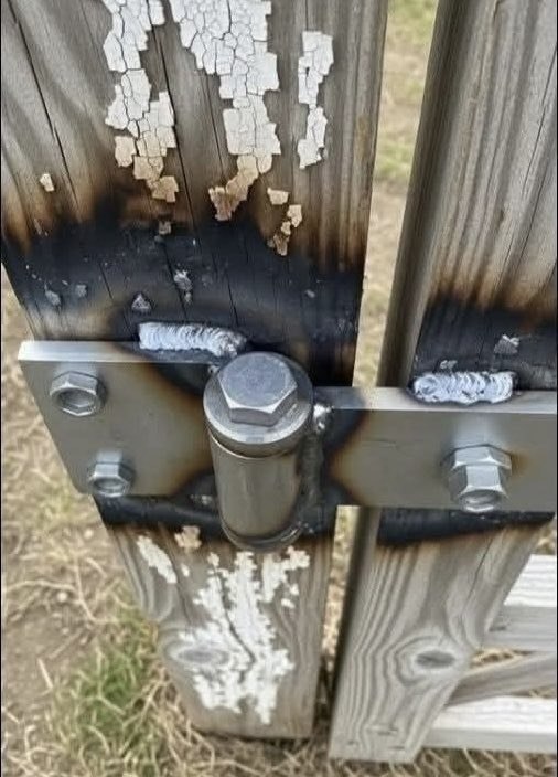 На изображении показан крупный план деревянного забора или ворот, где видны следы неаккуратной сварки. Металлическая петля приварена к металлической пластине, которая, в свою очередь, прикреплена к деревянным столбам с помощью болтов. Вокруг мест сварки на дереве остались отчетливые следы гари и облупившейся краски, что указывает на непрофессиональный подход к работе и отсутствие должной защиты дерева при проведении сварочных работ.