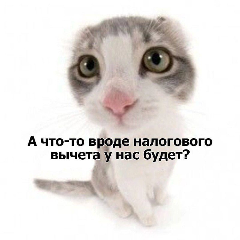 На изображении представлен милый котенок с большими, широко раскрытыми глазами, который смотрит прямо в камеру. Он сидит на белом фоне. Текст на картинке на русском языке гласит: "А что-то вроде налогового вычета у нас будет?" (А что-то вроде налогового вычета у нас будет?). Этот мем используется для выражения наивной или неожиданной просьбы, часто в контексте финансовых или бюрократических вопросов, когда персонаж, казалось бы, не имеет к этому отношения.