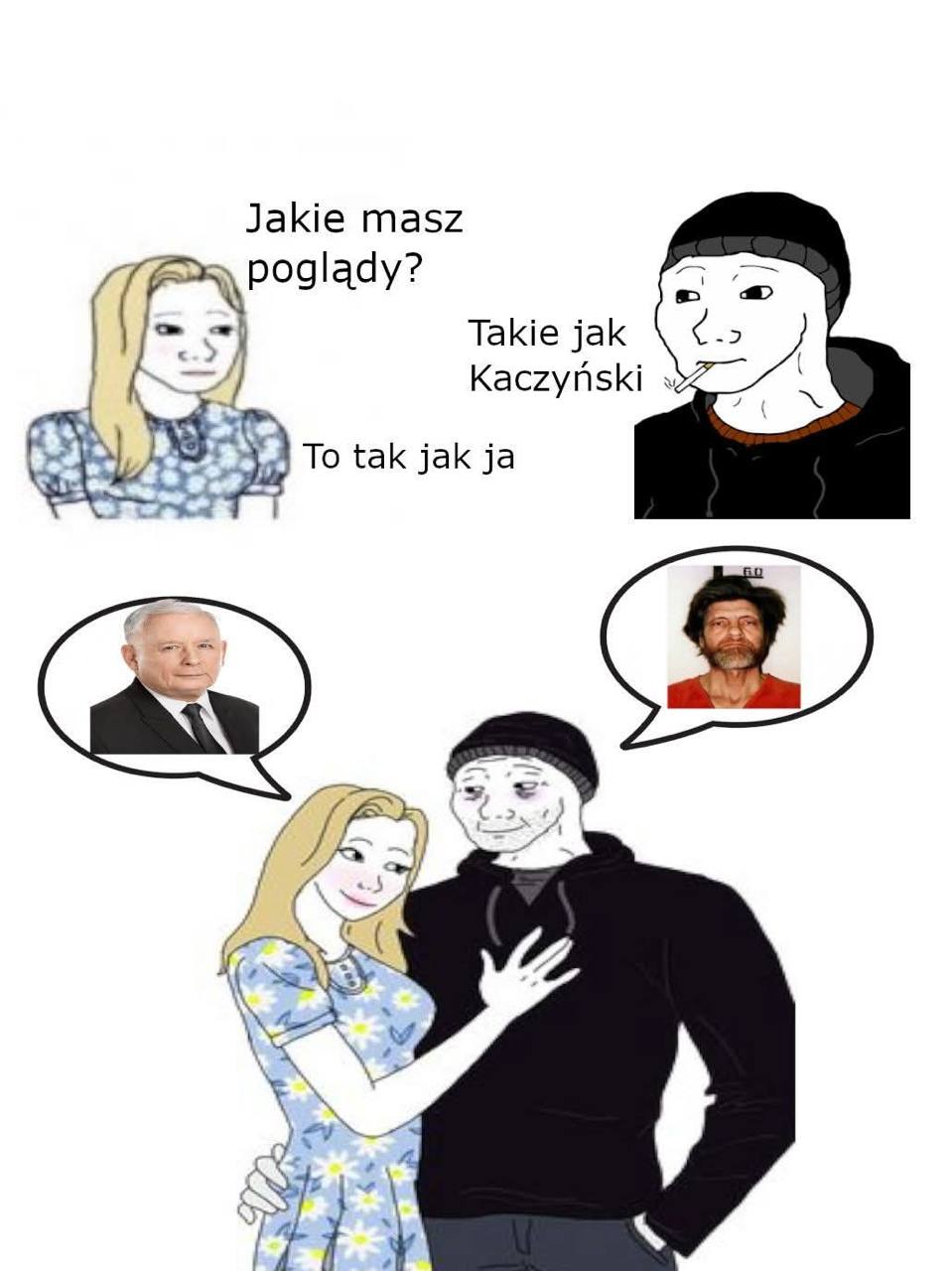 Мем изображает диалог между двумя персонажами, нарисованными в стиле Wojak. Девушка спрашивает: «Какие у тебя взгляды?». Молодой человек, выглядящий усталым, отвечает: «Такие как Качиньский». Девушка улыбается и говорит: «То так как я», при этом в её голове появляется изображение политика Ярослава Качиньского. Мужчина, кажется, немного недоволен и в его мыслях появляется изображение Теодора Качиньского, известного как Унабомбер. Мем обыгрывает созвучие фамилий, создавая комический эффект расхождений в политических предпочтениях.