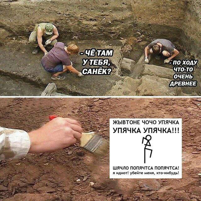 Мем состоит из двух частей. В верхней части показаны археологи, которые что-то раскапывают. Один из них спрашивает другого: «Че там у тебя, Санёк?», на что второй отвечает: «По ходу что-то очень древнее». В нижней части мема видно, как рука очищает землю кисточкой, а рядом появляется табличка с бессмысленным набором слов, имитирующих древний или непонятный язык: «Жывтоне чочо упячка упячка упячка!!!». Ниже под этим текстом написано: «Шячло попяртса попяртса! Я идиот! Убейте меня, кто-нибудь!». Этот мем высмеивает ситуации, когда обнаруживается что-то "очень древнее", которое на деле оказывается полной бессмыслицей или чем-то странным и непонятным. Таким образом, археологи находят не ценный артефакт, а абсурдную надпись.