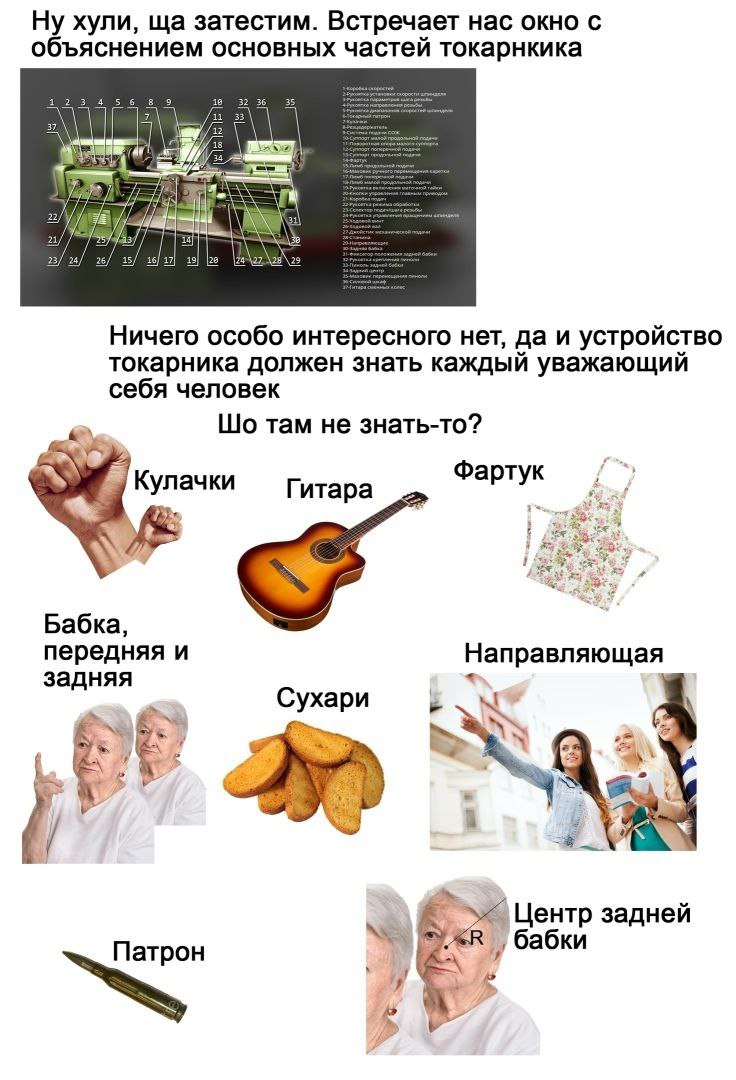 На картинке изображен токарный станок с обозначением всех его частей, а рядом – забавные сравнения этих частей с обычными предметами и людьми. Мем начинается со слов «Ну хули, ща затестим. Встречает нас окно с объяснением основных частей токарника». Затем идет надпись «Ничего особо интересного нет, да и устройство токарника должен знать каждый уважающий себя человек» и вопрос «Шо там не знать-то?». Далее следуют изображения кулачков (кулак), гитары (настоящая гитара), фартука (кухонный фартук), бабки (пожилые женщины), сухарей (еда), направляющей (девушки, показывающие направление), патрона (патрон от оружия) и центра задней бабки (пожилая женщина с точкой R на лбу).