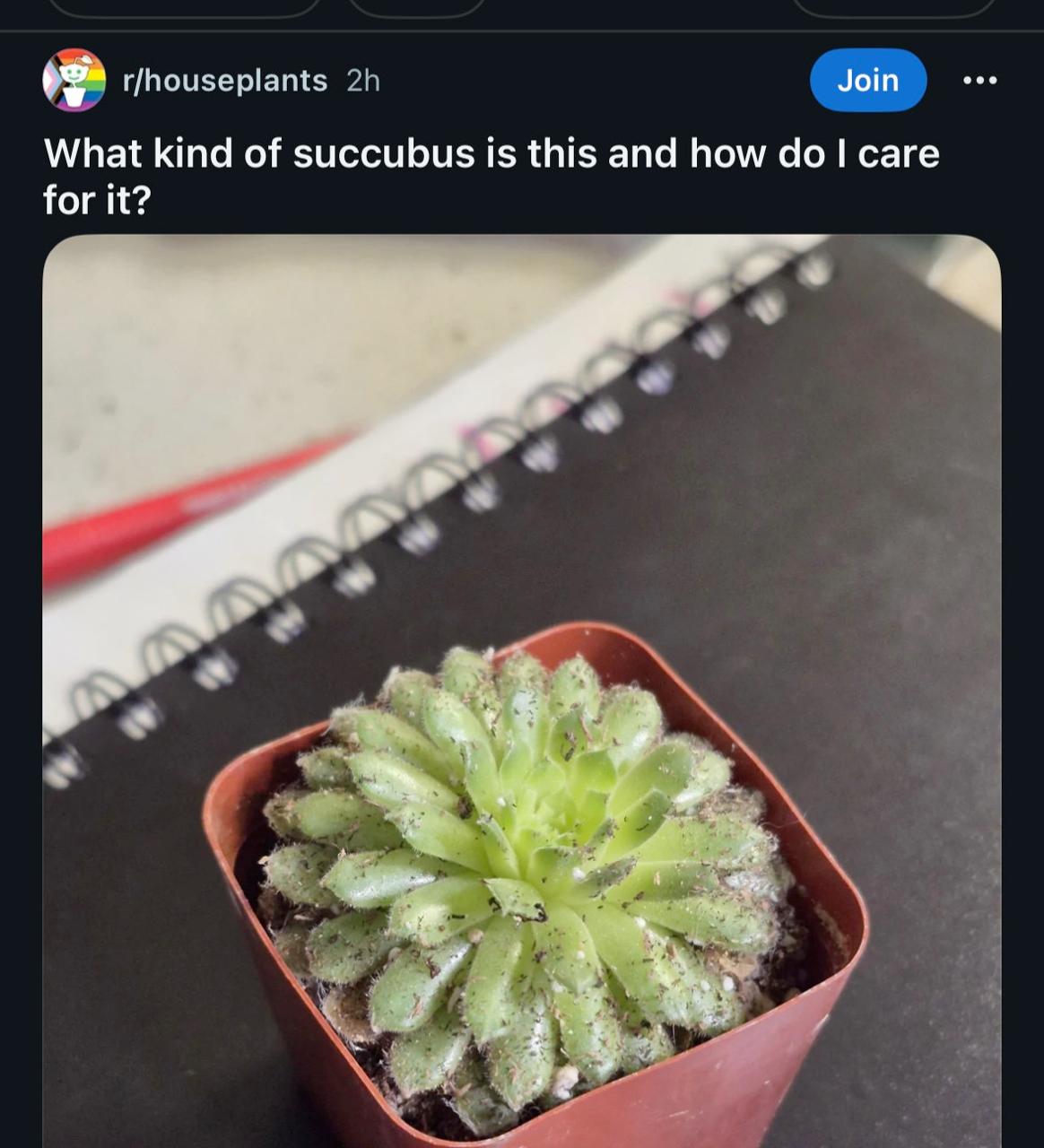 На изображении представлен скриншот из Reddit, где пользователь в сообществе r/houseplants задает вопрос о растении. В центре кадра — маленький зеленый суккулент в коричневом горшочке, который стоит на черном блокноте с пружинным переплетом. Суккулент имеет мясистые листья, покрытые чем-то вроде пушка или мелких частиц, что придает ему необычный вид. Вопрос пользователя звучит так: "What kind of succubus is this and how do I care for it?" что в переводе на русский означает: "Что это за суккуб и как мне о нем заботиться?". Этот вопрос вызывает комический эффект, так как слово "succubus" (суккуб, демон) звучит очень похоже на "succulent" (суккулент, растение).