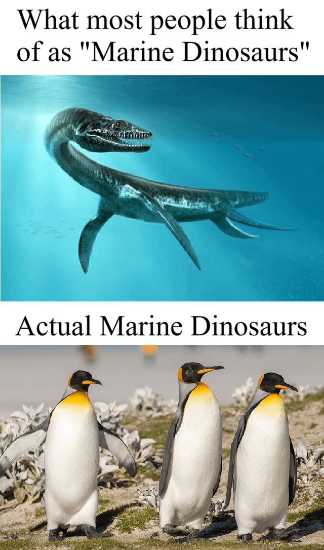 Мем разделён на две части. В верхней части изображено то, что большинство людей представляют под «морскими динозаврами»: длинное зубастое существо, плывущее в синей воде, похожее на плезиозавра или другого доисторического морского хищника. В нижней части показаны «настоящие морские динозавры» — три пингвина с жёлто-оранжевыми пятнами на шее и клюве, стоящие на суше, покрытой травой и камнями. Этот мем основан на факте, что пингвины являются потомками динозавров, а многие доисторические морские рептилии, такие как ихтиозавры, плезиозавры и мозазавры, не являются динозаврами, хотя часто ошибочно ассоциируются с ними в массовой культуре. Мем с юмором подчёркивает разницу между распространёнными заблуждениями и научными фактами, касающимися классификации древних и современных животных.