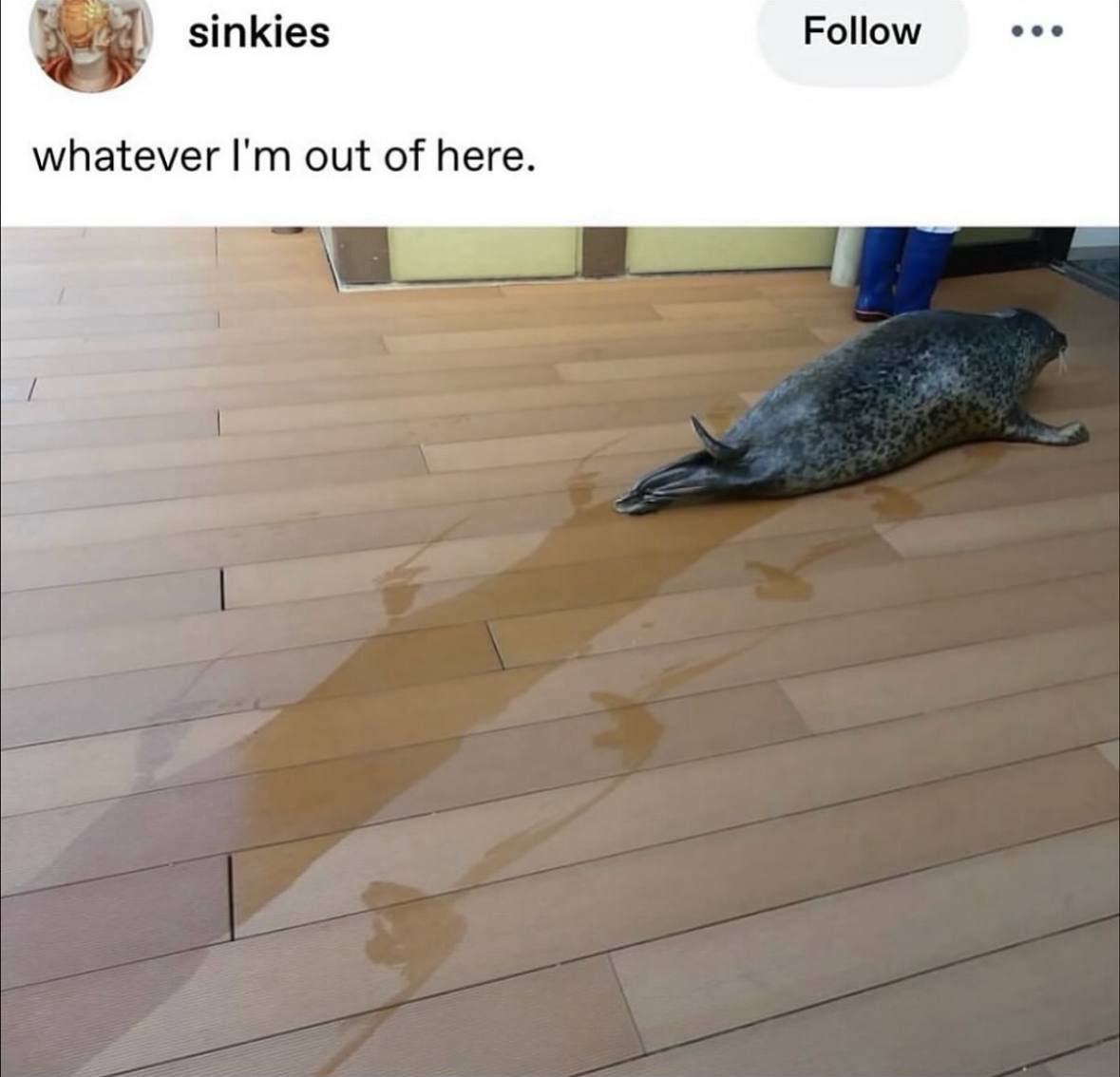 На изображении показан тюлень, лежащий на светло-коричневом деревянном полу, за ним тянется длинный мокрый след. Видно, что тюлень, кажется, движется или только что двигался, оставляя за собой мокрую дорожку. На заднем плане видны чьи-то ноги, вероятно, человека, который наблюдает за тюленем. Надпись на изображении гласит: "whatever i'm out of here" (всё равно, я ухожу отсюда), что добавляет комичности ситуации, создавая впечатление, будто тюлень "сбегает" или "уходит" из помещения, оставляя мокрый беспорядок за собой.