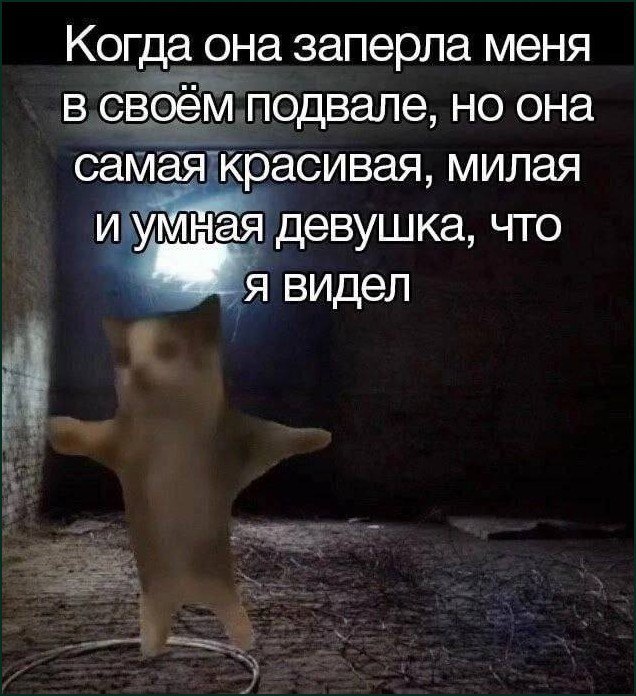 На изображении представлен мем с котом, стоящим на задних лапах в темном подвале, возможно, подземелье. В руках кот держит светящийся обруч, который служит источником света, освещая его морду и часть помещения. Выражение морды кота слегка недоуменное или даже блаженное, словно он не совсем понимает, что происходит, но при этом вполне доволен ситуацией. Надпись на меме гласит: «Когда она заперла меня в своём подвале, но она самая красивая, милая и умная девушка, что я видел». Эта фраза объясняет, почему кот, несмотря на заточение, выглядит счастливым — он влюблен в свою похитительницу. Мем обыгрывает абсурдность ситуации и чувство Стокгольмского синдрома, когда жертва испытывает симпатию к своему похитителю.
