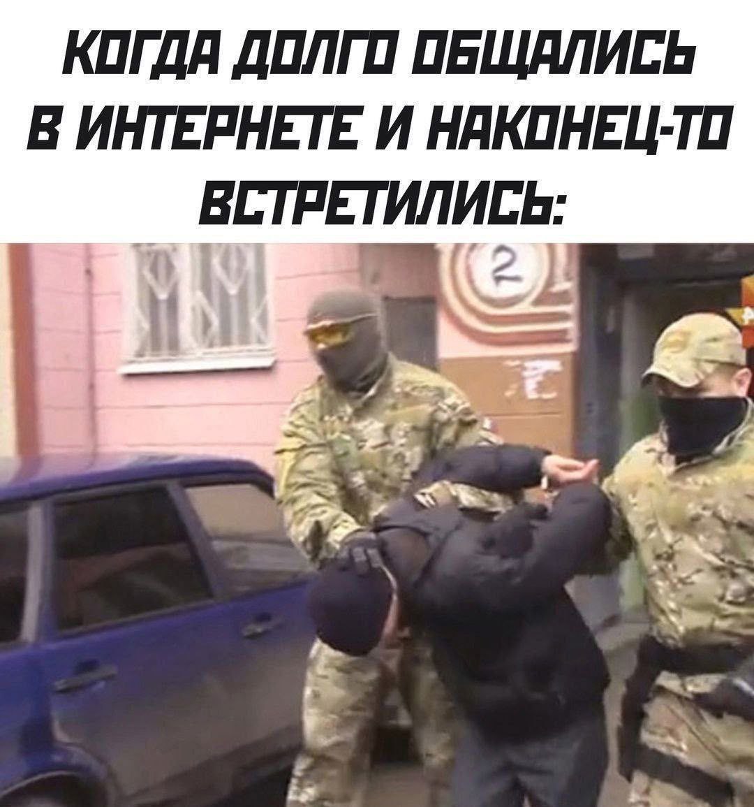 На картинке изображены трое мужчин на улице возле синей машины и розового здания. Двое мужчин, одетых в камуфляжную форму и балаклавы, задерживают третьего мужчину в черной куртке и шапке. Текст на картинке на русском языке гласит: "Когда долго общались в интернете и наконец-то встретились". Эта фраза "Когда долго общались в интернете и наконец-то встретились" с юмором описывает неожиданный и возможно неприятный исход встречи людей, которые долго общались онлайн, но встретились в реальной жизни в такой драматической ситуации. Это намек на то, что реальность может отличаться от ожиданий или что онлайн-общение скрывает истинную личность собеседника.