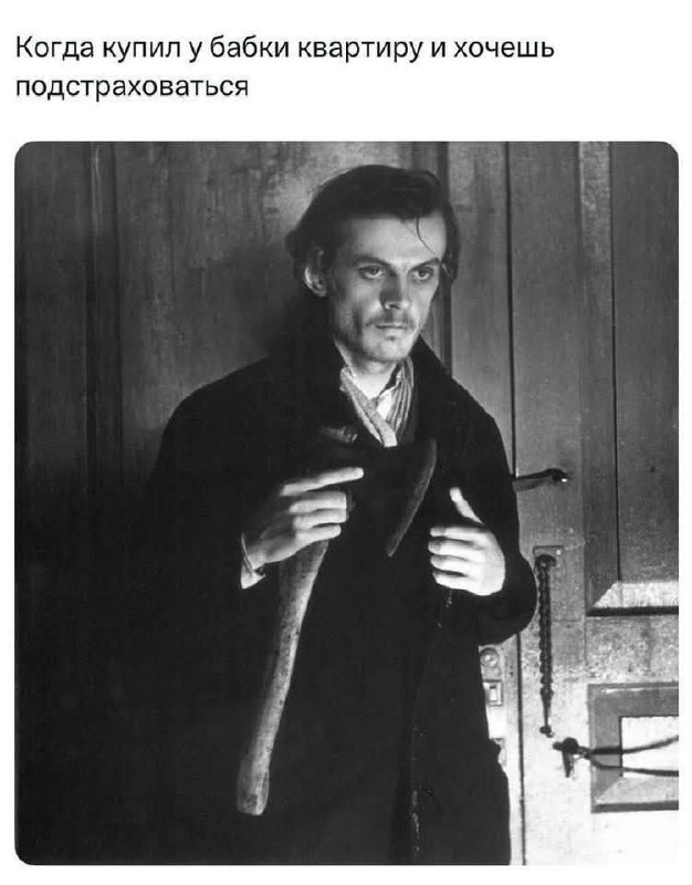 На чёрно-белой фотографии изображён худощавый мужчина с тёмными волосами и пронзительным взглядом, держащий топор. Мужчина одет в тёмное пальто и светлую рубашку. Фон за ним представляет собой старую деревянную дверь. Надпись сверху гласит: "Когда купил у бабки квартиру и хочешь подстраховаться" (When you bought an apartment from an old lady and want to play it safe). Это отсылка к сюжету романа Ф.М. Достоевского «Преступление и наказание», где главный герой Раскольников убивает старуху-процентщицу топором.