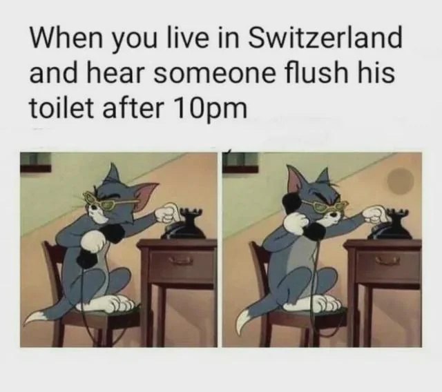 Мем состоит из двух частей: сверху текст, снизу изображение. Текст гласит: "When you live in Switzerland and hear someone flush his toilet after 10pm" (Когда ты живешь в Швейцарии и слышишь, как кто-то смывает воду в туалете после 22:00). Под текстом расположены два одинаковых кадра из мультфильма "Том и Джерри", на которых изображен кот Том. Он сидит на стуле, одетый в очки и сосредоточенно держит в одной лапе телефонную трубку, а другой лапой набирает номер на старом дисковом телефоне. Выражение его мордочки серьезное и деловое, будто он собирается доложить о нарушении. Мем высмеивает стереотипы о строгих правилах и дисциплине в Швейцарии, особенно касающихся шума в ночное время, и показывает, как бдительный житель готов немедленно сообщить о любом нарушении. Эта картинка стала популярной для иллюстрации ситуаций, когда люди слишком серьезно относятся к незначительным нарушениям или готовы донести на кого-то за мелочь. Том с телефоном символизирует чрезмерную бдительность и готовность к жалобам.
