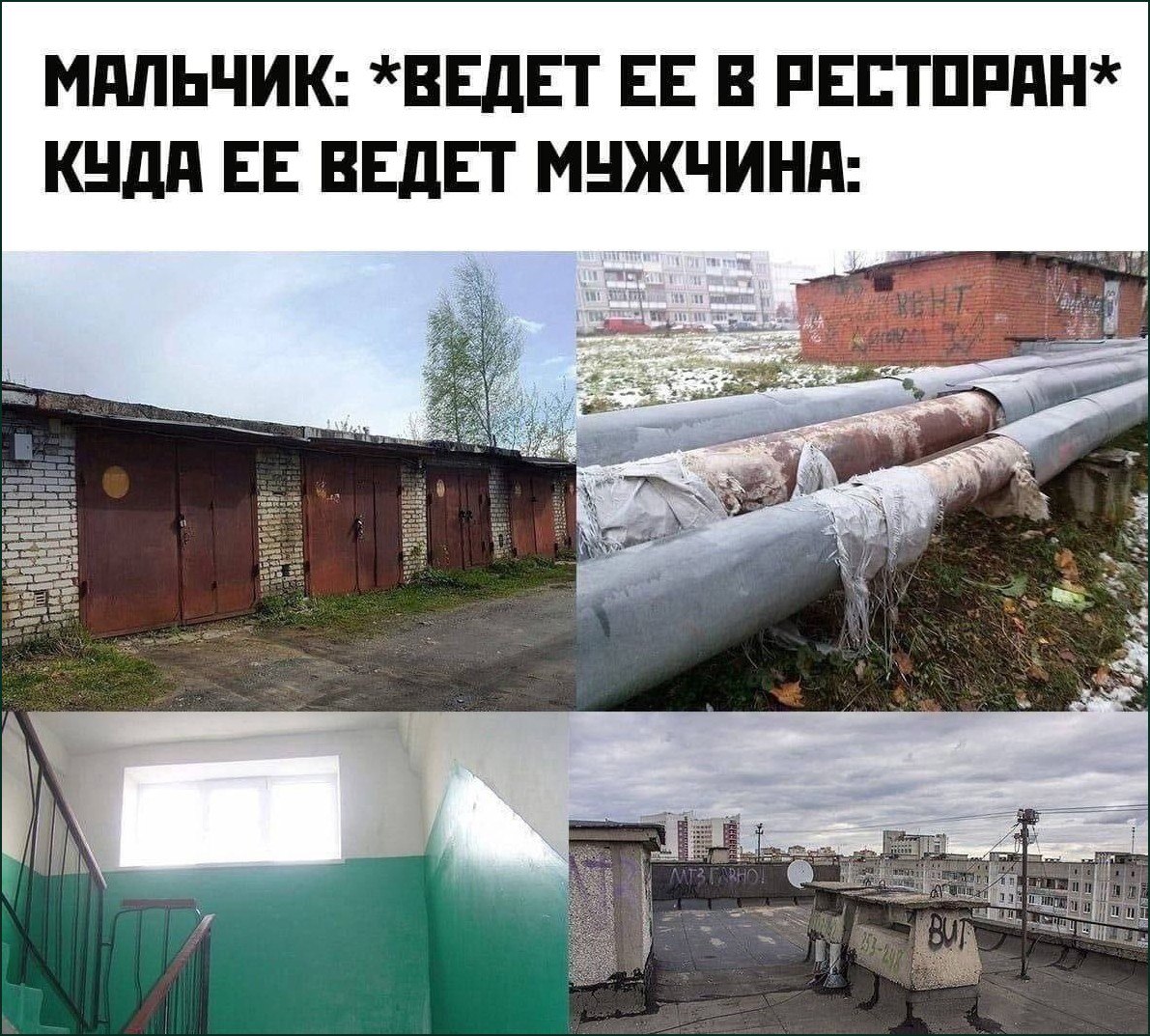 Мем изображает стереотипное представление о том, куда "мальчик" или молодой человек может вести девушку на свидание, в противовес тому, куда её "на самом деле" ведет "мужчина" или взрослый человек. Верхняя часть мема содержит текст: "Мальчик: *ведет ее в ресторан*" и "Куда ее ведет мужчина:", после чего следуют четыре фотографии, изображающие типичные неприглядные и обыденные места. На этих фотографиях можно увидеть ряд старых гаражей с ржавыми воротами, заброшенные теплотрассы с облезлой изоляцией на фоне кирпичного здания, обшарпанный подъезд с окном и зеленой краской на стенах, а также вид на серые крыши панельных домов и городские постройки под пасмурным небом. Эти изображения создают комический контраст между ожиданиями и реальностью.