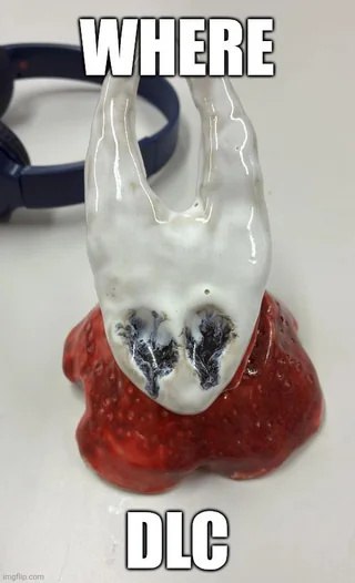 На изображении показана фигурка, напоминающая персонажа Хорнета из игры Hollow Knight, но с необычной внешностью. Возможно, это самодельная поделка, выполненная из керамики или другого материала. Фигурка стоит на белой поверхности, а на заднем плане видны тёмно-синие наушники. Персонаж выглядит расстроенным или даже злым, с белым туловищем, напоминающим голову с рожками, и тёмными глазницами. Основание фигурки выполнено в ярко-красном цвете, напоминающем ягоду, возможно, клубнику или малину. Над фигуркой и под ней расположены крупные белые надписи: "WHERE" (где) сверху и "DLC" (DLC) снизу, что, вероятно, является отсылкой к долгожданному дополнению к игре Hollow Knight, о котором геймеры ждут новостей. Это мем выражает нетерпение игроков, ожидающих новый контент для игры.