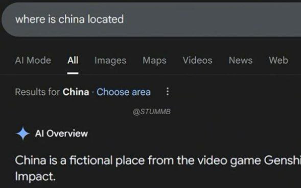 На скриншоте показан запрос в поисковой строке Google: «where is china located» (где находится Китай). Вместо корректного ответа, который обычно выдает поисковик, пользователь видит раздел «AI Overview» (Обзор ИИ), где написано: «China is a fictional place from the video game Genshin Impact» (Китай — это вымышленное место из видеоигры Genshin Impact). Этот мем подчеркивает абсурдность некоторых ответов, которые иногда выдает искусственный интеллект, смешивая реальные факты с вымышленными мирами видеоигр.