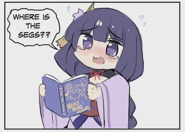 На изображении показана Баал, также известная как Райдэн Эи, из игры Genshin Impact, которая расстроена и даже плачет, держа в руках книгу. На обложке книги написано "YAE PB HOUSE DOKI DOKI MONA", что является отсылкой к фанфикам и контенту от фанатов. Из ее рта выходит облачко с надписью "WHERE IS THE SEGS??", что переводится как "ГДЕ СЕКС??", указывая на разочарование персонажа в отсутствии откровенного содержания в книге. Возможно, она ожидала найти там более "взрослый" контент, но вместо этого получила что-то невинное или совершенно другое.
