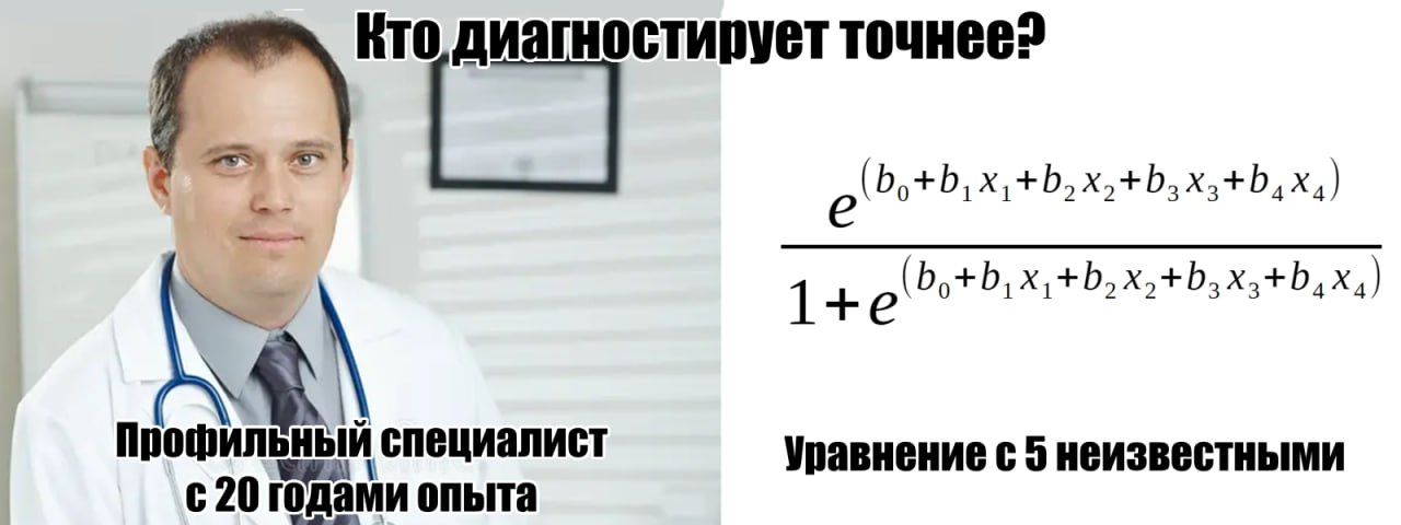 На изображении представлен коллаж, разделенный на две части. Слева изображен молодой мужчина в белом медицинском халате и со стетоскопом на шее, он выглядит как профильный специалист с 20-летним опытом. Справа — сложное математическое уравнение с 5 неизвестными, которое обычно используется в статистике или машинном обучении для предсказания вероятности какого-либо события. Мем сравнивает, кто способен диагностировать точнее: опытный врач или уравнение с множеством переменных. Суть мема заключается в противопоставлении человеческого опыта и сложных алгоритмов, намекая на растущую роль искусственного интеллекта и математических моделей в таких областях, как медицина.