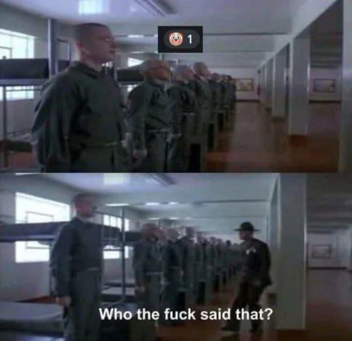 Мем состоит из двух кадров, взятых из фильма "Цельнометаллическая оболочка". На верхнем кадре изображен ряд солдат в казарме, стоящих навытяжку. Над одним из солдат висит иконка уведомления с эмодзи клоуна и цифрой "1". Это символизирует какой-то комментарий или реакцию, которую посчитали глупой или неуместной. На нижнем кадре тот же ряд солдат, но теперь на переднем плане стоит сержант в широкополой шляпе, обернувшийся и смотрящий на них. Под ним крупным шрифтом написана фраза "Who the fuck said that?" (Кто, блять, это сказал?), что демонстрирует его гневную реакцию на "комментарий клоуна".