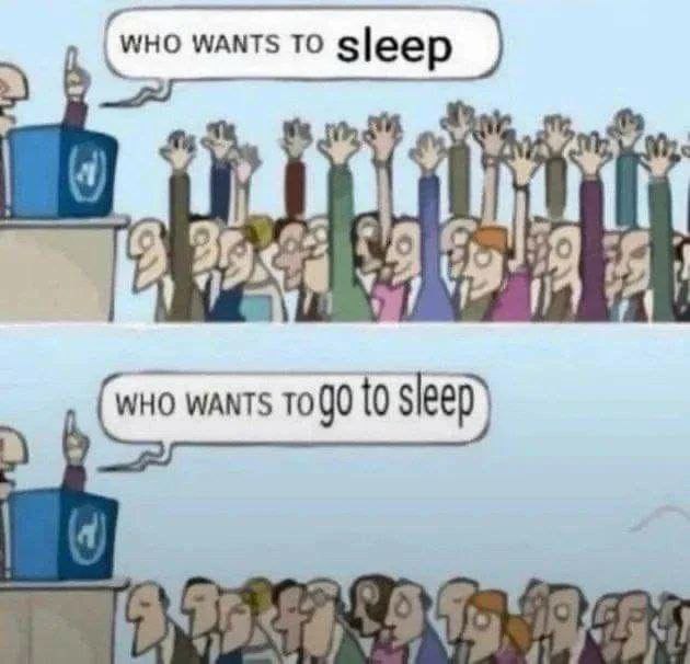 На двухпанельном меме изображен человек, стоящий за кафедрой с логотипом ООН, который задает два разных вопроса толпе. На верхней панели спикер спрашивает: "WHO WANTS TO sleep" (кто хочет спать), и множество людей в толпе поднимают руки в знак согласия. На нижней панели тот же спикер задает другой вопрос: "WHO WANTS TO go to sleep" (кто хочет идти спать), и на этот раз почти никто не поднимает руки, выражая нежелание ложиться спать. Мем высмеивает разницу между желанием спать в целом и нежеланием прекращать текущую деятельность, чтобы отправиться в кровать.