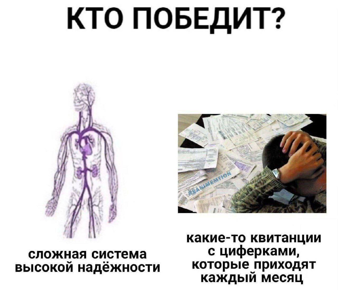 Мем "Кто победит?" изображает противопоставление двух сущностей, одна из которых — сложная и надежная система, а другая — непонятные квитанции, приходящие каждый месяц. Слева на белом фоне изображена схема кровеносной системы человека с подписью "сложная система высокой надёжности". Справа — человек, закрывший лицо руками, сидящий за столом, заваленным всевозможными квитанциями и документами. Подпись под ним гласит: "какие-то квитанции с циферками, которые приходят каждый месяц". В верхней части мема крупными буквами задан вопрос: "Кто победит?". Этот мем юмористически обыгрывает извечную борьбу человека с бюрократией и финансовыми обязательствами, которые порой кажутся непосильными даже для самой совершенной системы, такой как человеческий организм. Это также может быть отсылкой к проблемам со здоровьем, которые могут возникнуть из-за постоянного стресса, связанного с попытками разобраться во всех платежах.