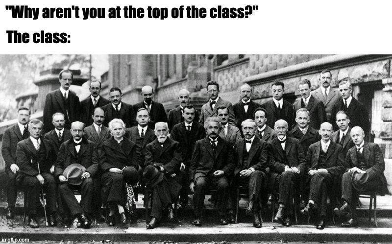 На картинке изображен диалог. Сверху черными буквами на белом фоне написано: «Why aren't you at the top of the class?» (Почему ты не лучший в классе?). Ниже следует подпись «The class:» (Класс:), а под ней – черно-белая фотография группы известных ученых, участников Сольвеевского конгресса, среди которых легко узнаваемый Альберт Эйнштейн, Мария Кюри и Макс Планк. Они сидят и стоят на ступеньках здания. Выражение лиц у большинства серьезное и сосредоточенное. Эта фотография символизирует "класс" выдающихся умов, что делает вопрос о том, почему кто-то не является лучшим в таком "классе", ироничным. Мем "Почему ты не лучший в классе?" с Сольвеевским конгрессом используется для демонстрации ситуации, когда от человека требуют быть лучшим в очень высококонкурентной или сложной среде, где даже средний уровень является выдающимся.