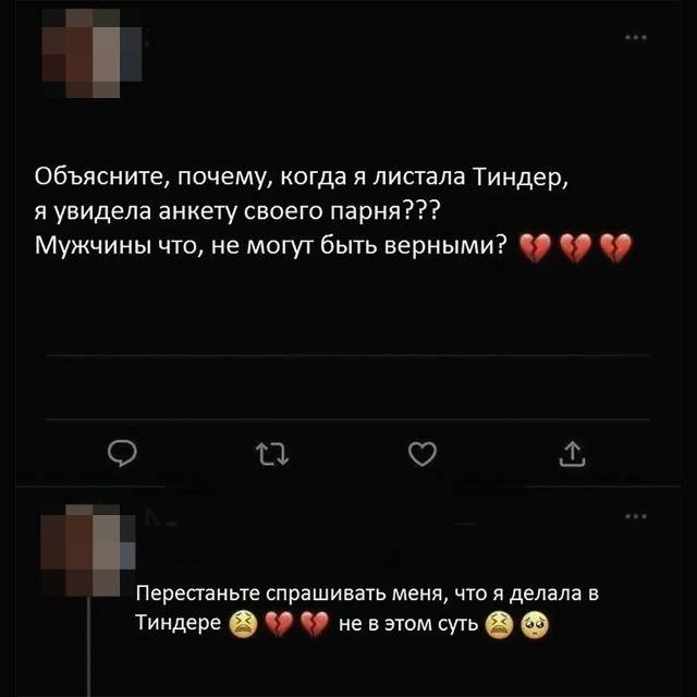 Объясните, почему, когда я листала Тиндер, я увидела анкету своего парня??? Мужчины что, не могут быть верными? Перестаньте спрашивать меня, что я делала в Тиндере. Не в этом суть.