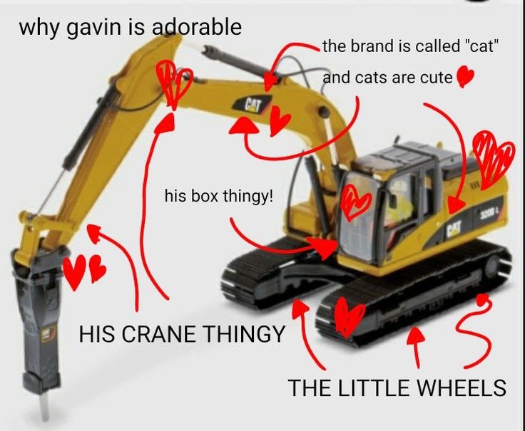 На изображении показан желтый игрушечный экскаватор, предположительно модели Cat 320D L, на белом фоне. Сверху надпись "why gavin is adorable", что переводится как "почему Гэвин очарователен". По всей картинке разбросаны красные стрелки и нарисованные сердечки, указывающие на различные части экскаватора, такие как "his box thingy!" (его штука-коробка!), "his crane thingy" (его штука-кран), "the little wheels" (маленькие колесики). Также одна стрелка указывает на надпись "CAT" на экскаваторе с пояснением "the brand is called 'cat' and cats are cute" (бренд называется 'cat', а кошки милые). Эти подписи и сердечки, очевидно, выражают привязанность и восхищение этим предметом, сравнивая его с чем-то милым, возможно, с кошкой.