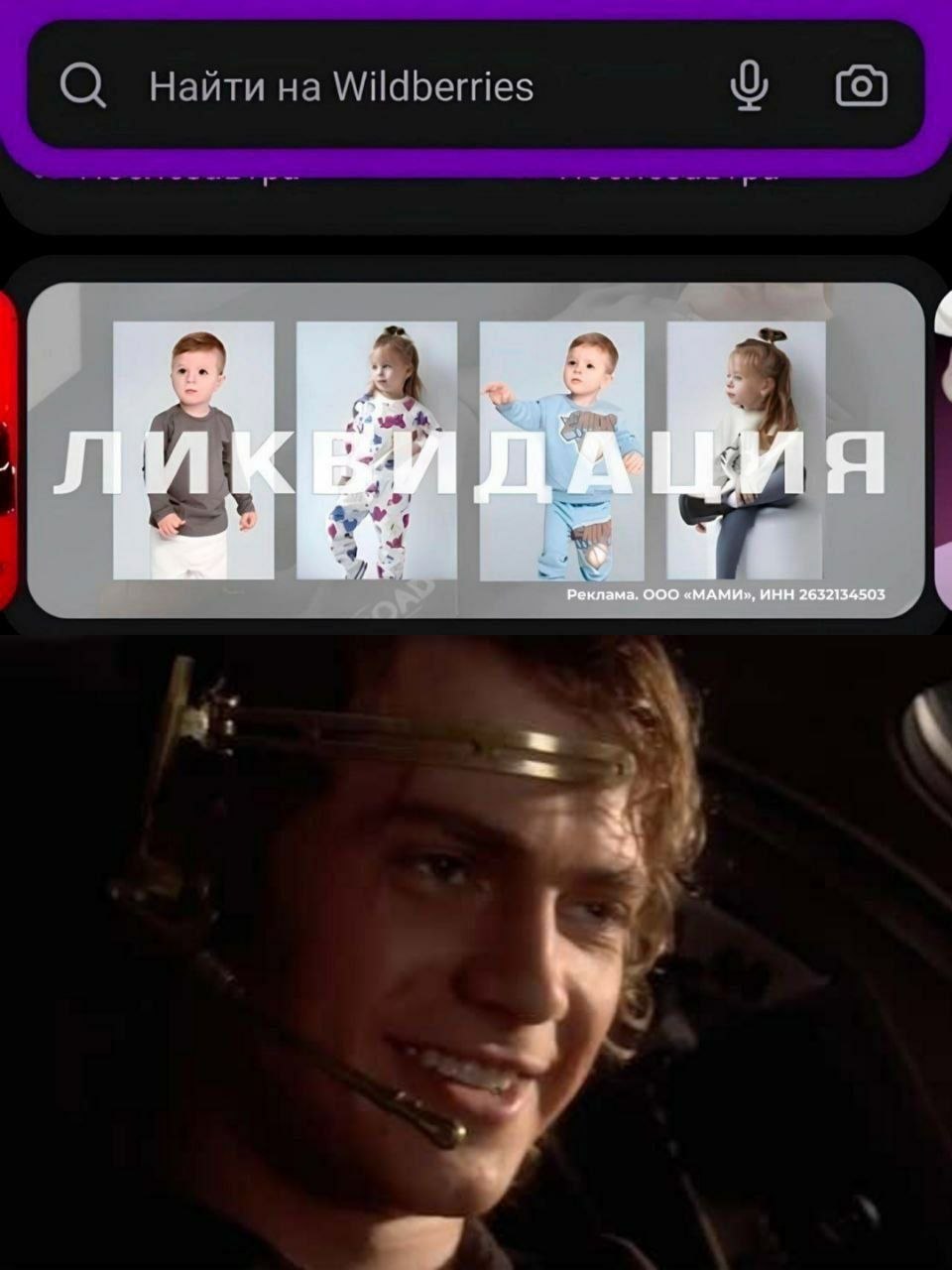 На картинке представлен скриншот экрана телефона, на котором сверху находится поисковая строка Wildberries с надписью «Найти на Wildberries». Ниже расположена реклама детской одежды с крупной надписью «Ликвидация», которая частично закрывает изображения четырех детей в разной одежде. Под рекламой довольный Энакин Скайуокер из «Звездных войн» с улыбкой смотрит в сторону, с гарнитурой на голове. Мем обыгрывает слово «ликвидация» (уничтожение), которое в данном контексте используется для распродажи детской одежды, в то время как выражение лица Энакина, известного как "убийца детей" из Звездных войн, придает этому слову зловещий оттенок. Это создает юмористический контраст между невинной рекламой и мрачной коннотацией.