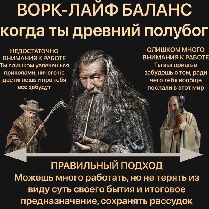 Мем на черном фоне демонстрирует концепцию ворк-лайф баланса на примере персонажей из "Властелина колец". В центре изображения - Гендальф, курящий трубку, что символизирует "правильный подход". Слева от него изображен Радагаст, олицетворяющий "недостаточно внимания к работе", а справа - Саруман, представляющий "слишком много внимания к работе". Каждая из этих частей сопровождается текстом, объясняющим последствия каждого подхода к работе и жизни. Мем "Ворк-лайф баланс когда ты древний полубог" в юмористической форме показывает различные подходы к работе, используя образы волшебников. Текст на меме гласит: "Недостаточно внимания к работе: ты слишком увлечешься приколами, ничего не достигнешь и про тебя все забудут". "Слишком много внимания к работе: ты выгоришь и забудешь о том, ради чего тебя вообще послали в этот мир". А правильный подход в том, что можно "много работать, но не терять из виду суть своего бытия и итоговое предназначение, сохранять рассудок". Этот мем актуален для тех, кто ищет золотую середину между карьерой и личной жизнью.