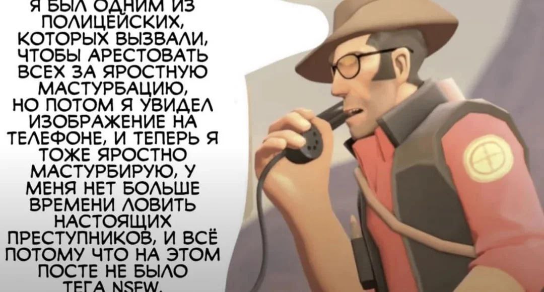 На изображении представлен персонаж из игры Team Fortress 2, известный как Снайпер, который держит в руке телефонную трубку старого образца. Снайпер выглядит встревоженным или шокированным, его рот приоткрыт, а глаза широко раскрыты за очками. Рядом с изображением Снайпера расположен большой текстовый блок на русском языке. Текст рассказывает историю от первого лица о полицейском, которого вызвали арестовывать людей за "яростную мастурбацию". Однако, увидев некое изображение на телефоне, этот полицейский сам начал "яростно мастурбировать" и теперь у него нет времени ловить преступников, потому что на посте не было тега NSFW.