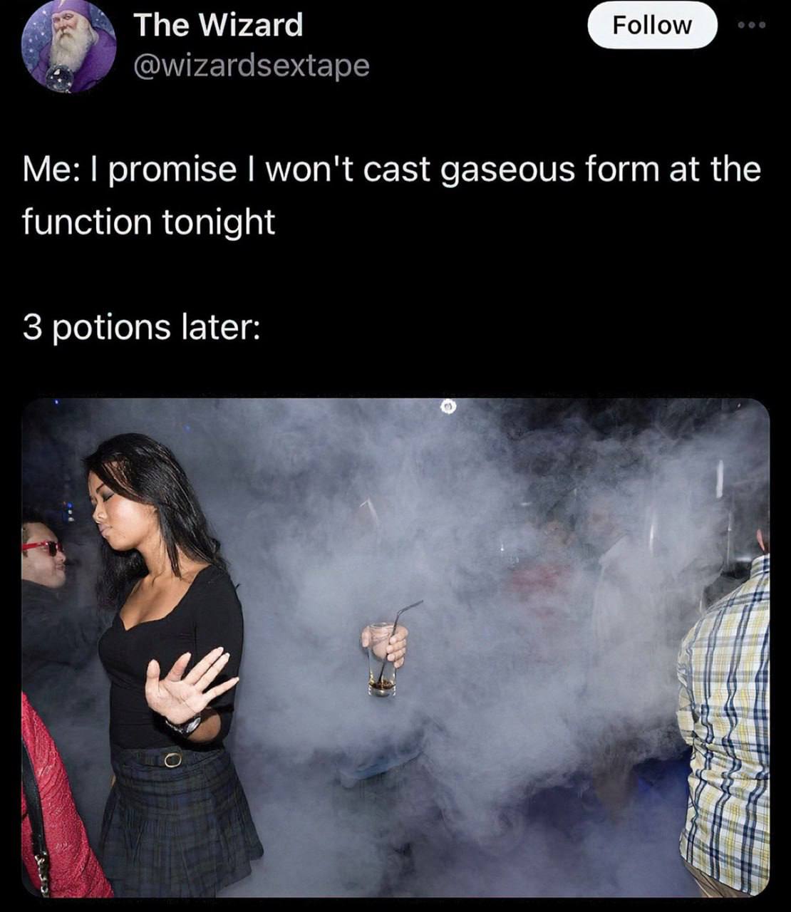 На изображении представлен мем из Твиттера, который состоит из двух частей: текстового поста и фотографии. В верхней части мема показан скриншот поста из Твиттера от пользователя под ником The Wizard (@wizardsex_tape), на аватарке которого изображен седобородый волшебник в фиолетовой мантии. Текст поста гласит: «Me: I promise I won't cast gaseous form at the function tonight. 3 potions later:». В нижней части мема находится фотография, предположительно, сделанная на вечеринке или в ночном клубе, где очень много дыма или тумана. На переднем плане, слева, стоит девушка с длинными темными волосами, одетая в черную кофту с вырезом и клетчатую юбку. Она смотрит налево, отвернувшись от центра кадра, и держит правую руку ладонью вперед, как будто останавливая кого-то или что-то. Справа от неё, в густом дыму, видна только рука, держащая стакан с напитком и двумя соломинками, что создает впечатление, будто рука парит в воздухе без тела, слившегося с дымом. За рукой виднеются размытые очертания других людей и источников света, создавая атмосферу таинственности и веселья. Мужчина в клетчатой рубашке стоит справа, повернувшись спиной к центру. Слева за девушкой виднеется еще один человек в красных очках.