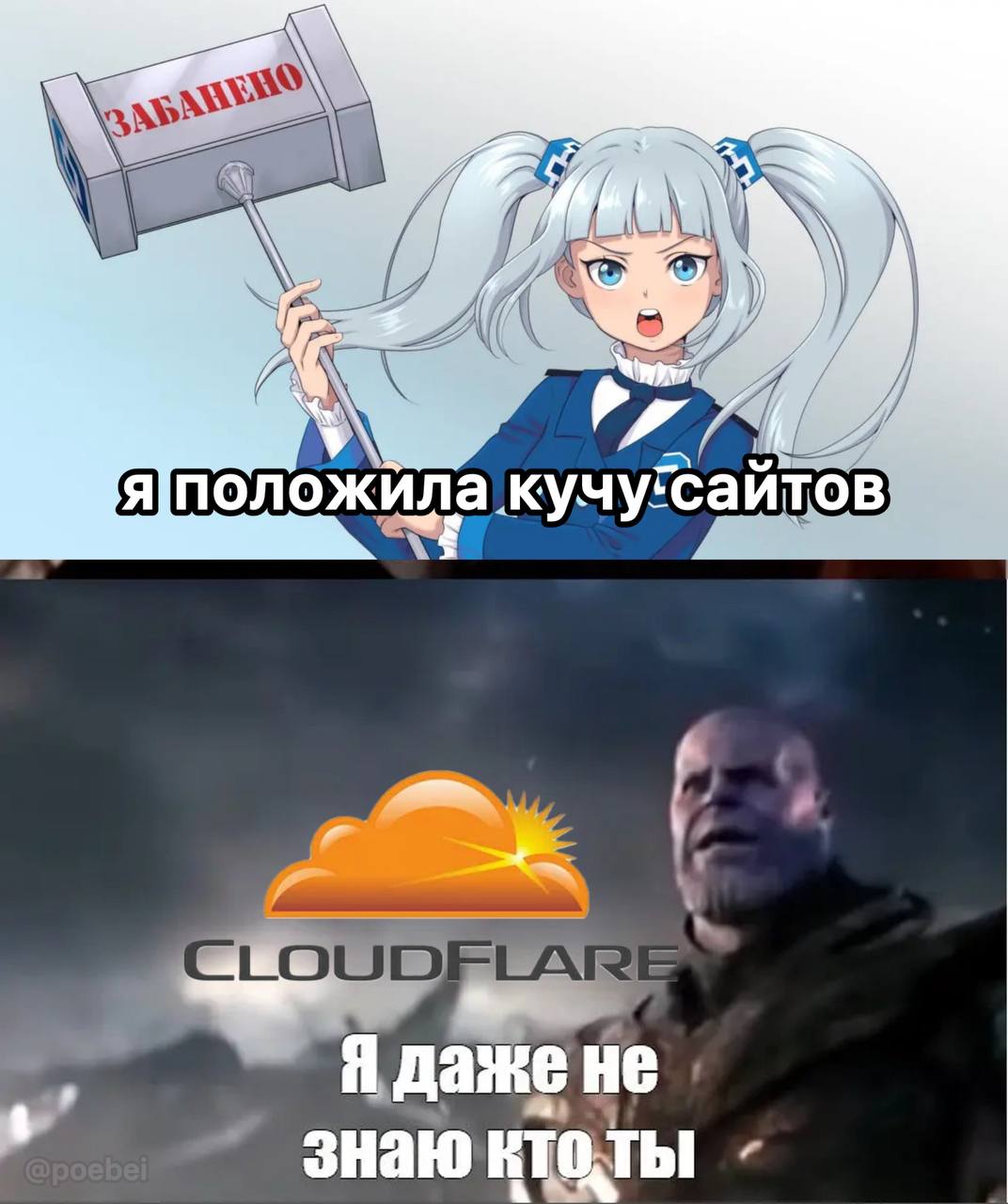 Мем состоит из двух частей. В верхней части аниме-девушка с двумя хвостами, одетая в синюю школьную форму, держит большой банхаммер с надписью «ЗАБАНЕНО» и хвастается: «Я положила кучу сайтов». Ее лицо выражает гордость и некоторую злобу. В нижней части мема изображен логотип Cloudflare на фоне космического пейзажа с Таносом из киновселенной Marvel, который с недоумением смотрит вдаль и произносит: «Я даже не знаю кто ты». Этот мем высмеивает ситуацию, когда мелкие хакеры или пользователи гордятся своими достижениями в интернете, но их действия остаются незамеченными для крупных корпораций или защитных систем, таких как Cloudflare, которые обеспечивают безопасность и стабильность огромного количества сайтов. Иными словами, девушка утверждает, что "положила кучу сайтов", а Танос, символизирующий Cloudflare, отвечает ей: "Я даже не знаю, кто ты".