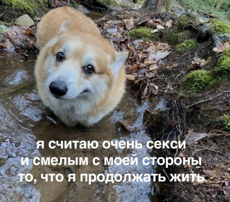 На изображении представлен милый корги, стоящий в небольшой грязной луже в лесу. Собака смотрит прямо в камеру с немного виноватым, но очень очаровательным выражением морды, будто она только что совершила какую-то шалость. На заднем плане виден лесной пейзаж с опавшими листьями и мхом на земле. Подпись на картинке гласит: "я считаю очень секси и смелым с моей стороны то, что я продолжать жить", что переводится как: "я считаю очень сексуальным и смелым с моей стороны то, что я продолжаю жить". Этот мем часто используется для выражения самоиронии или усталости от жизни, когда человек, несмотря ни на что, продолжает справляться с трудностями, воспринимая это как героический поступок. Милый корги, стоящий в луже, добавляет комичности и беззащитности к этому заявлению.