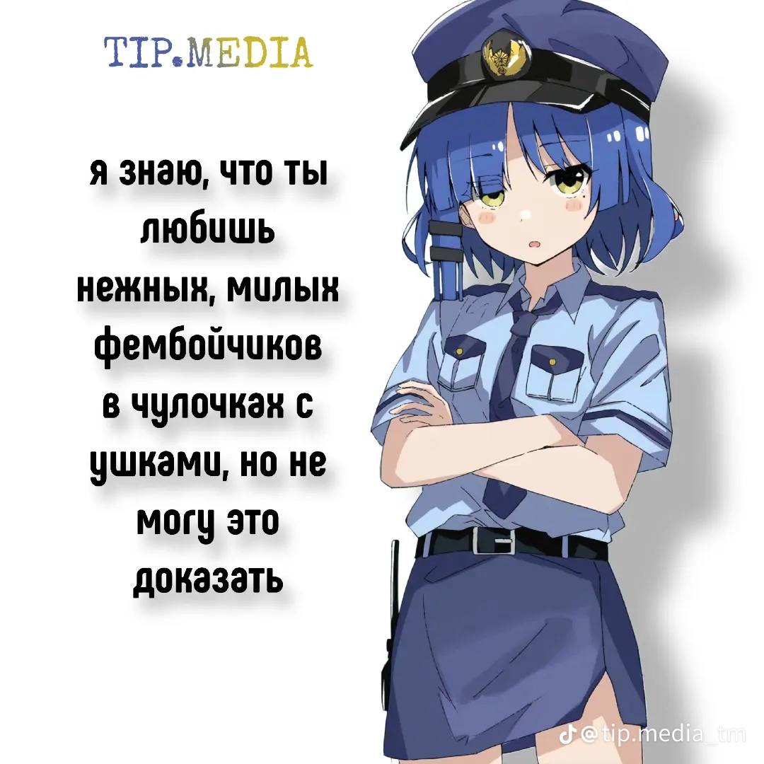 На картинке изображена аниме-девушка в полицейской форме с синими волосами, стоящая скрестив руки на груди. Рядом с ней расположен текст, который гласит: "Я знаю, что ты любишь нежных, милых фембойчиков в чулочках с ушками, но не могу это доказать". Это означает, что несмотря на наличие такой информации, доказательств у говорящего нет. Мем, скорее всего, используется для шуток о предпочтениях в интернете или о скрытых желаниях, которые сложно признать или подтвердить. Образ полицейского добавляет комический оттенок "расследования" или "поимки" чьих-то вкусов.
