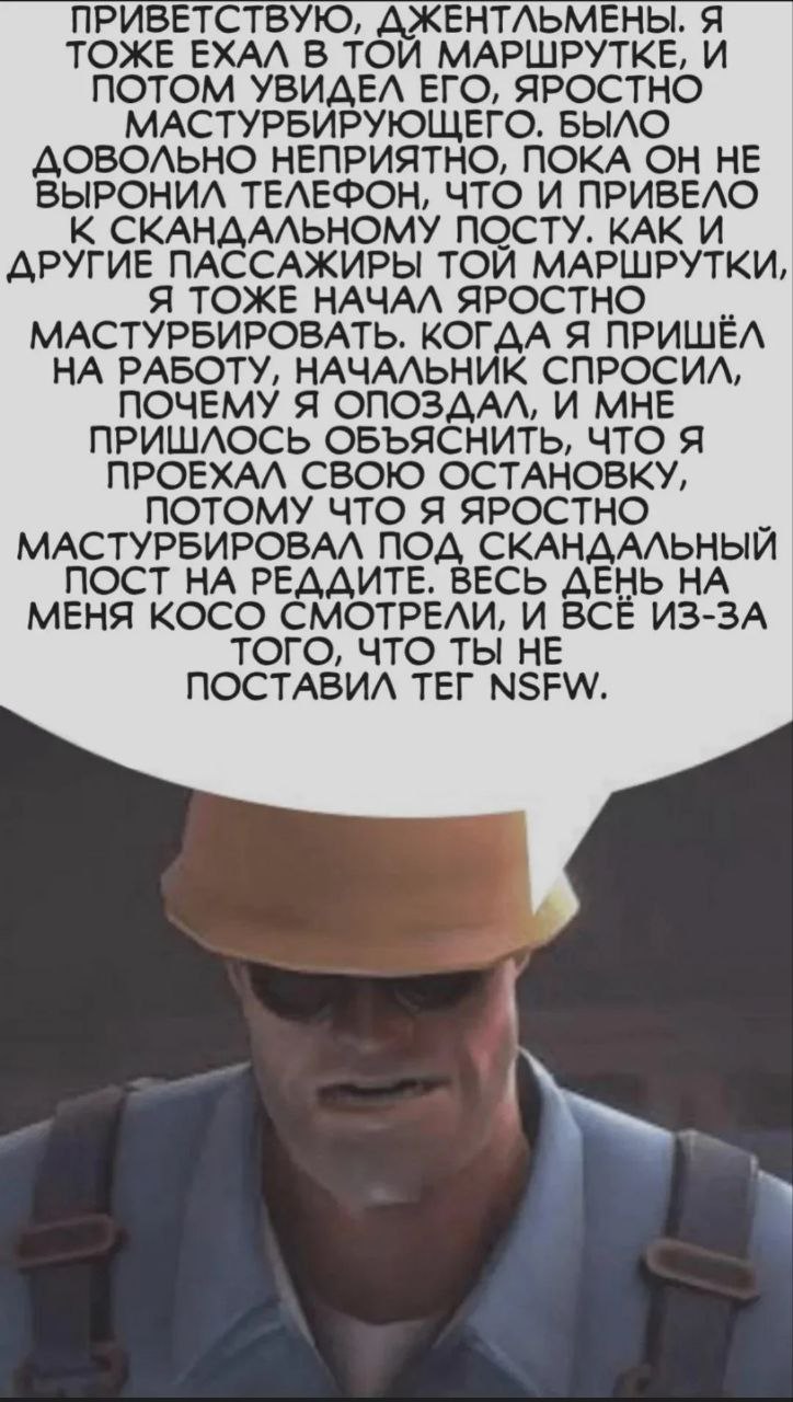 На картинке изображён мужчина в жёлтой строительной каске, тёмных очках и синей рубашке с лямками, выглядящий озабоченным или расстроенным. Над ним расположен длинный текст чёрного цвета на сером фоне. Текст, который начинается с "ПРИВЕТСТВУЮ, ДЖЕНТЛЬМЕНЫ", рассказывает юмористическую историю о том, как рассказчик, увидев другого человека, яростно мастурбирующего в маршрутке, сам начал яростно мастурбировать после того, как тот выронил телефон, что привело к "скандальному посту" на Реддите. Это заставило рассказчика проехать свою остановку, опоздать на работу и объяснить начальнику причину, а также весь день получать косые взгляды от коллег – и всё потому, что автор поста не поставил тег NSFW. Эта история, которая дословно переводится как "Яростно мастурбирующий под скандальный пост на Реддите", является типичным примером интернет-юмора, основанного на преувеличении и абсурдности ситуаций. Отсутствие тега NSFW (Not Safe For Work) часто является причиной неловких или нежелательных просмотров контента в неподходящих местах, что обыгрывается в этом меме.