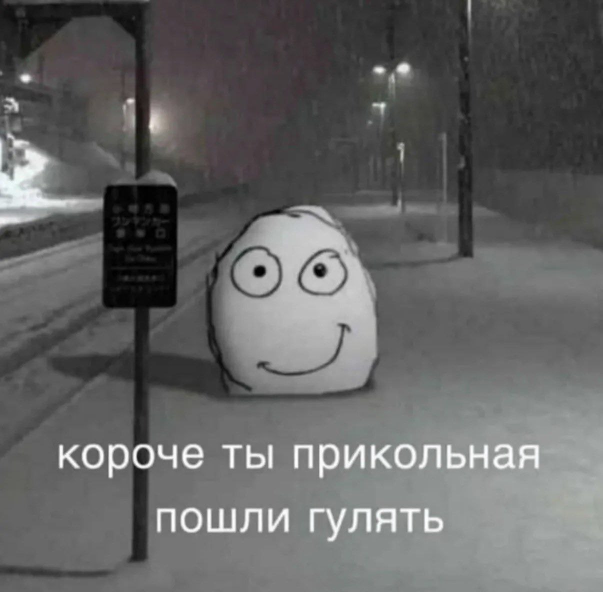 На картинке изображен пухлый белый персонаж с нарисованными большими круглыми глазами и улыбкой, напоминающий снежный ком или абстрактное существо. Он стоит на заснеженной улице ночью, вокруг снегопад, видно фонарные столбы и, вероятно, дорогу. Надпись на изображении гласит: «короче ты прикольная пошли гулять», что переводится как «короче ты прикольная, пошли гулять». Этот мем часто используется для флирта или непринужденного приглашения куда-либо, выражая одновременно простоту и уверенность.