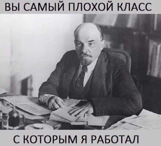 На чёрно-белой фотографии изображён Владимир Ильич Ленин, сидящий за столом, заваленным бумагами. На нём пиджак, жилетка и галстук. Его взгляд серьёзен, брови слегка нахмурены, а бородка аккуратно подстрижена. Левая рука лежит на стопке документов, правая держит ещё одну стопку. На заднем плане виден книжный шкаф. Надпись на изображении гласит: «Вы самый плохой класс, с которым я работал». Это шутка, в которой Ленин выступает в роли учителя или руководителя, недовольного своими подопечными.
