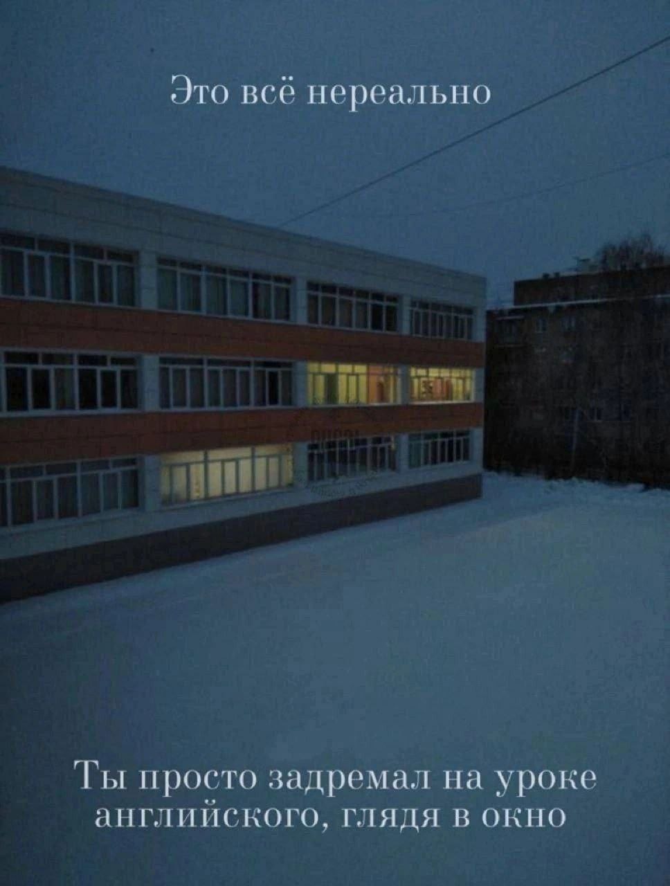 На изображении представлен вид на школу зимой в сумерках или ранним утром. Снег покрывает землю, а на небе видна линия электропередачи. Некоторые окна в здании школы светятся желтым светом, создавая ощущение уюта внутри на фоне холодной, темной улицы. Сверху и снизу на изображении расположен текст: "Это всё нереально" и "Ты просто задремал на уроке английского, глядя в окно", что подразумевает, что вся окружающая действительность – это сон или фантазия, навеянная скучным уроком и видом за окном.
