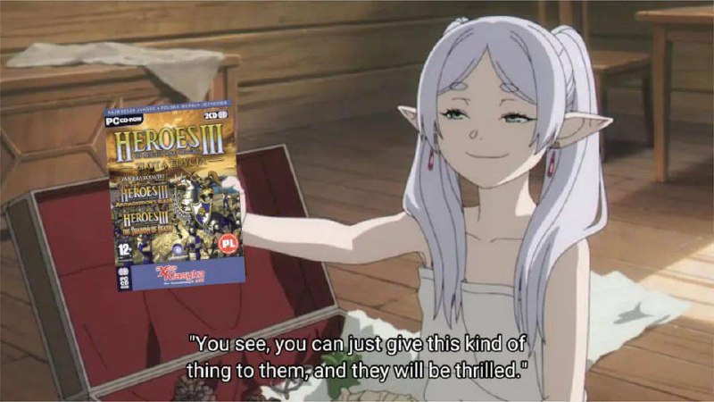 Мем изображает молодую девушку-эльфа с длинными белыми волосами и большими ушами, которая держит в руках диск с игрой Heroes of Might and Magic III. Она хитро улыбается, словно зная какой ценный подарок держит. Девушка одета в простое белое платье, а на заднем плане видна деревянная комната. Подпись к мему гласит: «You see, you can just give this kind of thing to them, and they will be thrilled», что переводится как «Видите, вы можете просто дать им что-то подобное, и они будут в восторге». Этот мем часто используется для иллюстрации того, как простые и проверенные временем вещи могут принести огромную радость, особенно если речь идет о классических видеоиграх или ностальгических предметах. Он также может применяться для показа универсальности определенных подарков или решений, которые гарантированно вызовут положительную реакцию у большинства людей. Улыбка эльфийки намекает на то, что она знает секрет счастья.