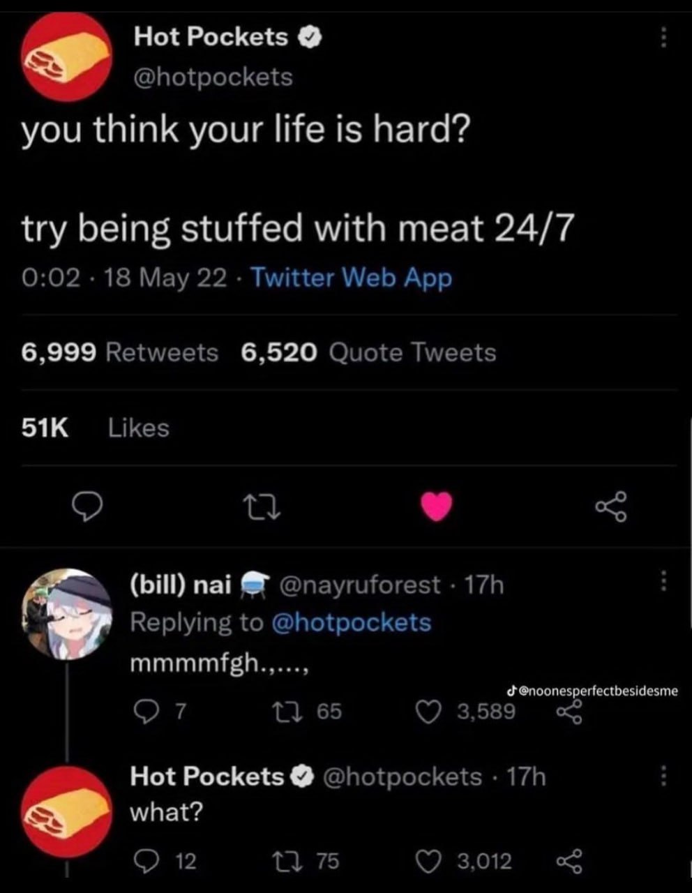 Мем представляет собой скриншот из Твиттера, на котором бренд Hot Pockets (производитель замороженных сэндвичей) задает вопрос: "You think your life is hard? Try being stuffed with meat 24/7" (Вы думаете, что ваша жизнь трудна? Попробуйте быть набитым мясом 24/7). Пользователь с ником (bill) nai отвечает на это сообщение с непристойным "mmmmfgh..,,.,", на что Hot Pockets отвечает кратким "what?". Вся переписка происходит на черном фоне с белым текстом, характерным для интерфейса Твиттера. Текст "Вы думаете, что ваша жизнь трудна? Попробуйте быть набитым мясом 24/7" от Hot Pockets является саркастическим комментарием о трудностях жизни, а ответ пользователя придает диалогу комичный и неожиданный сексуальный подтекст.