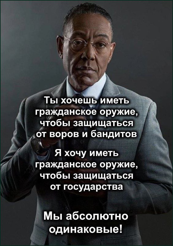 Мем с Густаво Фрингом из сериала \"Во все тяжкие\" и \"Лучше звоните Солу\", на котором он изображен в деловом костюме на тёмном фоне. Фринг смотрит прямо на зрителя с серьезным выражением лица. Справа от него расположен текст, который говорит о праве на владение гражданским оружием. Сначала задается вопрос: \"Ты хочешь иметь гражданское оружие, чтобы защищаться от воров и бандитов?\", затем дается ответ от лица Фринга: \"Я хочу иметь гражданское оружие, чтобы защищаться от государства\". В заключение он говорит: \"Мы абсолютно одинаковые!\". Мем иронизирует над разными, но схожими мотивами владения оружием, показывая, что люди могут искать защиту как от преступности, так и от злоупотреблений власти. Несмотря на разные причины, желание защищаться является общим.
