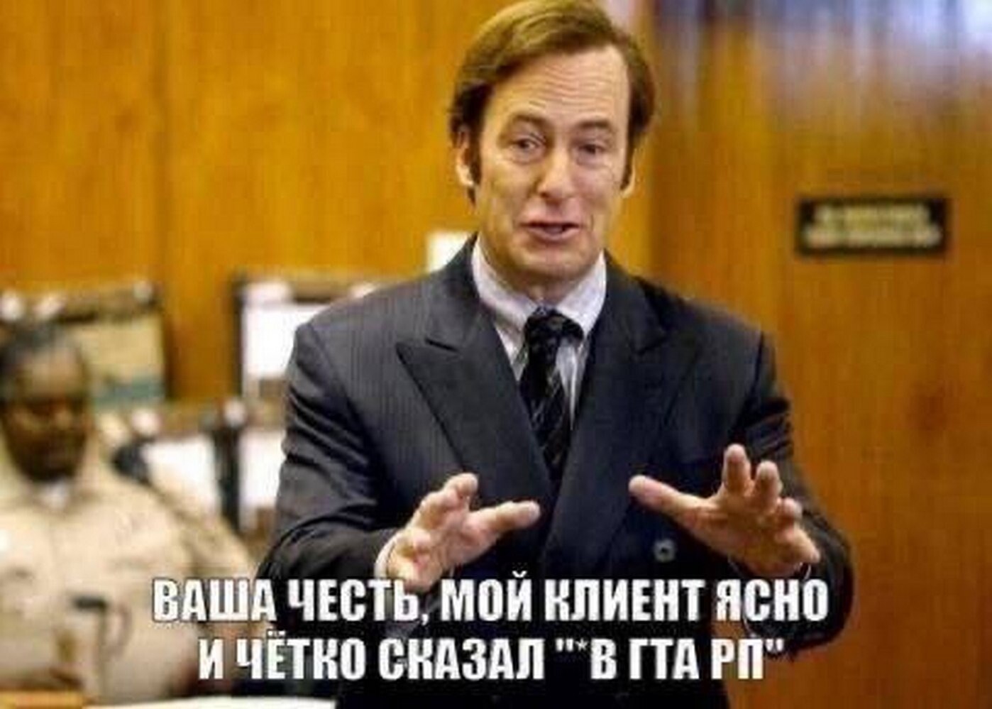 На изображении представлен Сол Гудман, персонаж сериала "Лучше звоните Солу", в костюме и галстуке, стоящий в зале суда. Он разводит руками, как бы доказывая свою точку зрения, и уверенно смотрит вперёд. На фоне видны деревянные стены и расфокусированный силуэт другого человека. Надпись на меме гласит: "Ваша честь, мой клиент ясно и чётко сказал "*" в гта рп". Эта фраза высмеивает ситуации в ролевых играх Grand Theft Auto (GTA RP), где игроки используют текстовые команды для описания действий, а звёздочка часто используется как обозначение таких действий, что может быть интерпретировано в суде как доказательство невиновности или правильности действий.