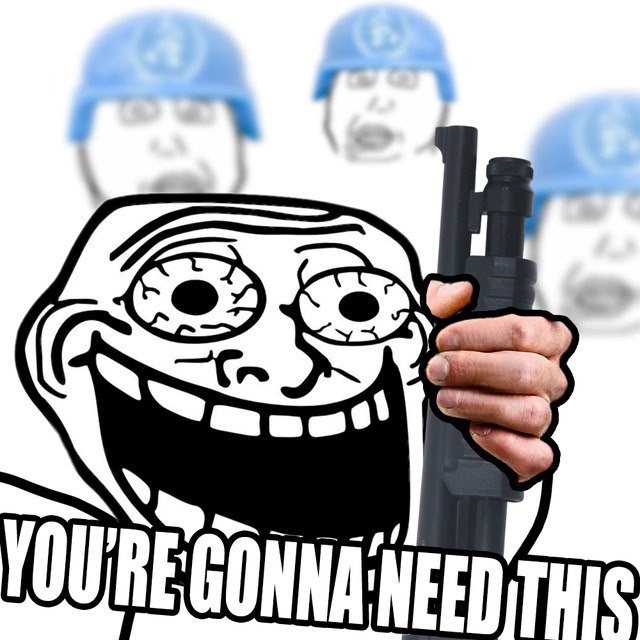 На картинке изображен мем с лицом тролля, у которого безумный взгляд и широкая ухмылка. В руке он держит пистолет. На фоне видны три лица людей в голубых касках. Внизу изображения надпись: «You're gonna need this». Этот мем может использоваться, чтобы показать, что кому-то понадобится помощь или защита в сложной ситуации, или просто как шутка.