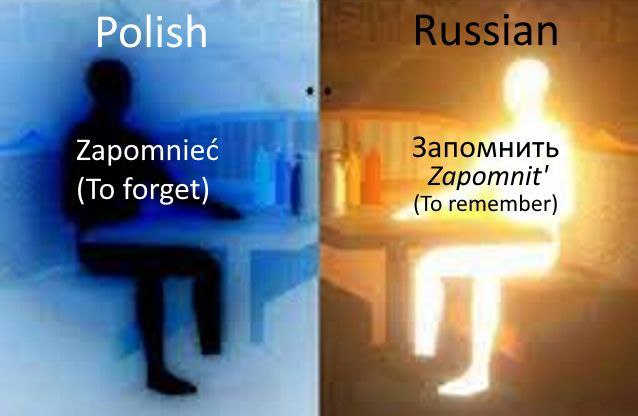 Polish Zapomnieć (To forget). Russian Запомнить Zapomnit' (To remember).